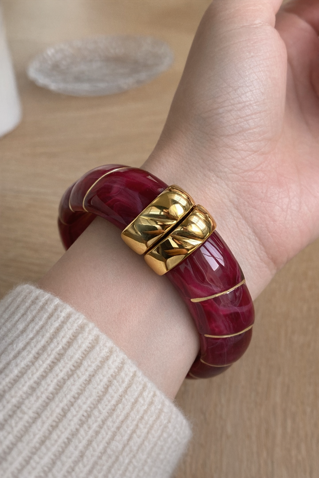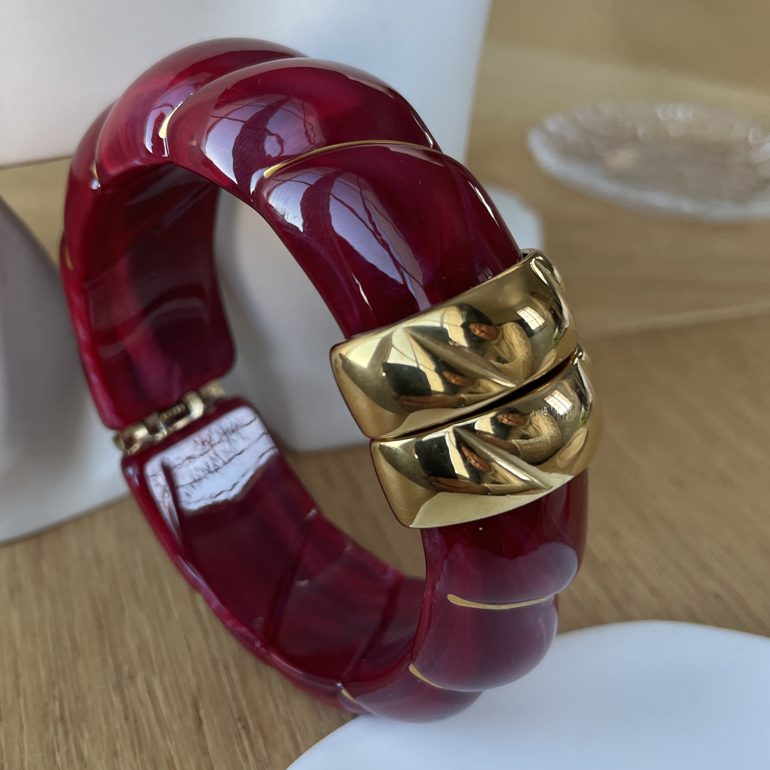 Audacieux et résolument élégant, le bracelet Agathe se distingue par son volume généreux et sa teinte rouge profond, intense et lumineuse.