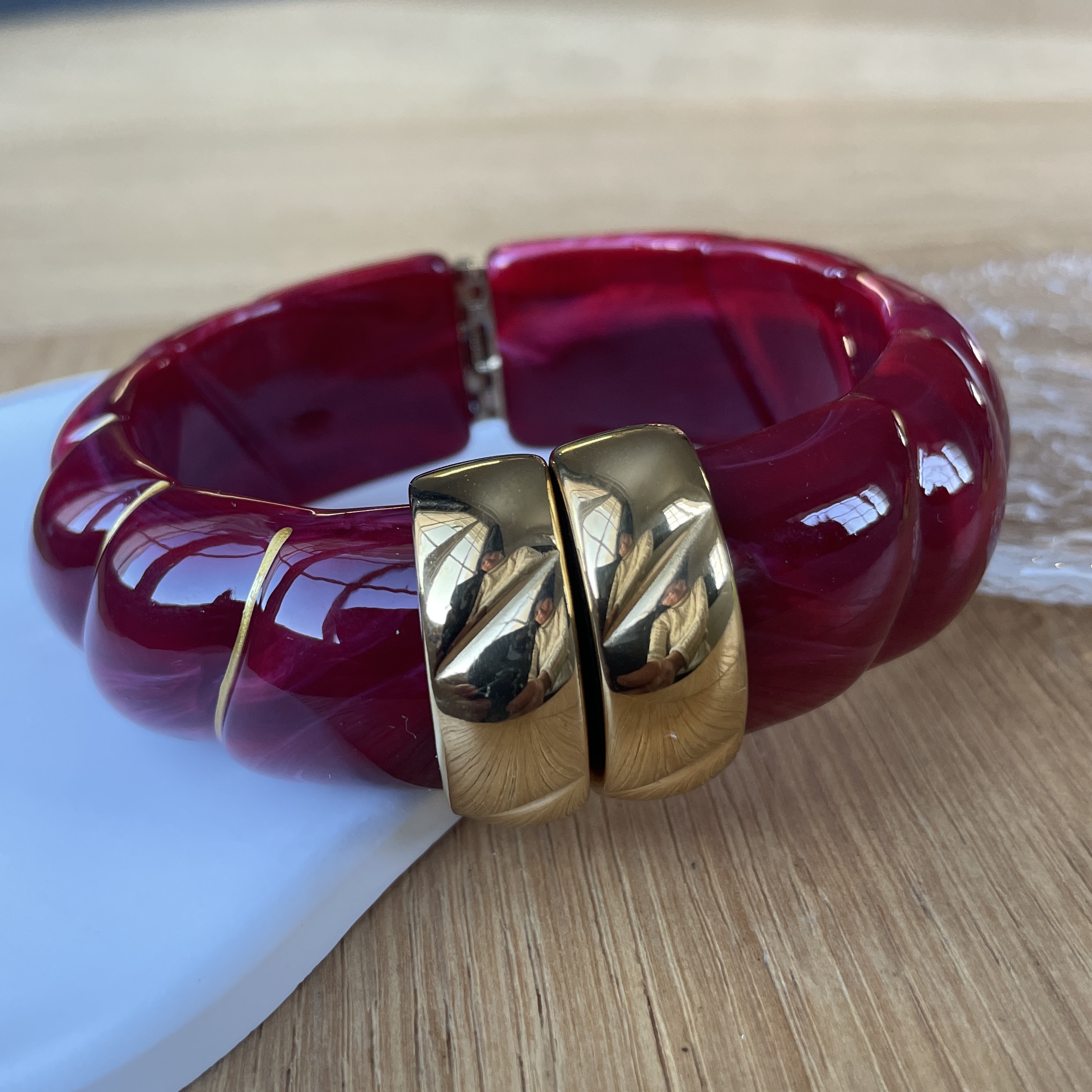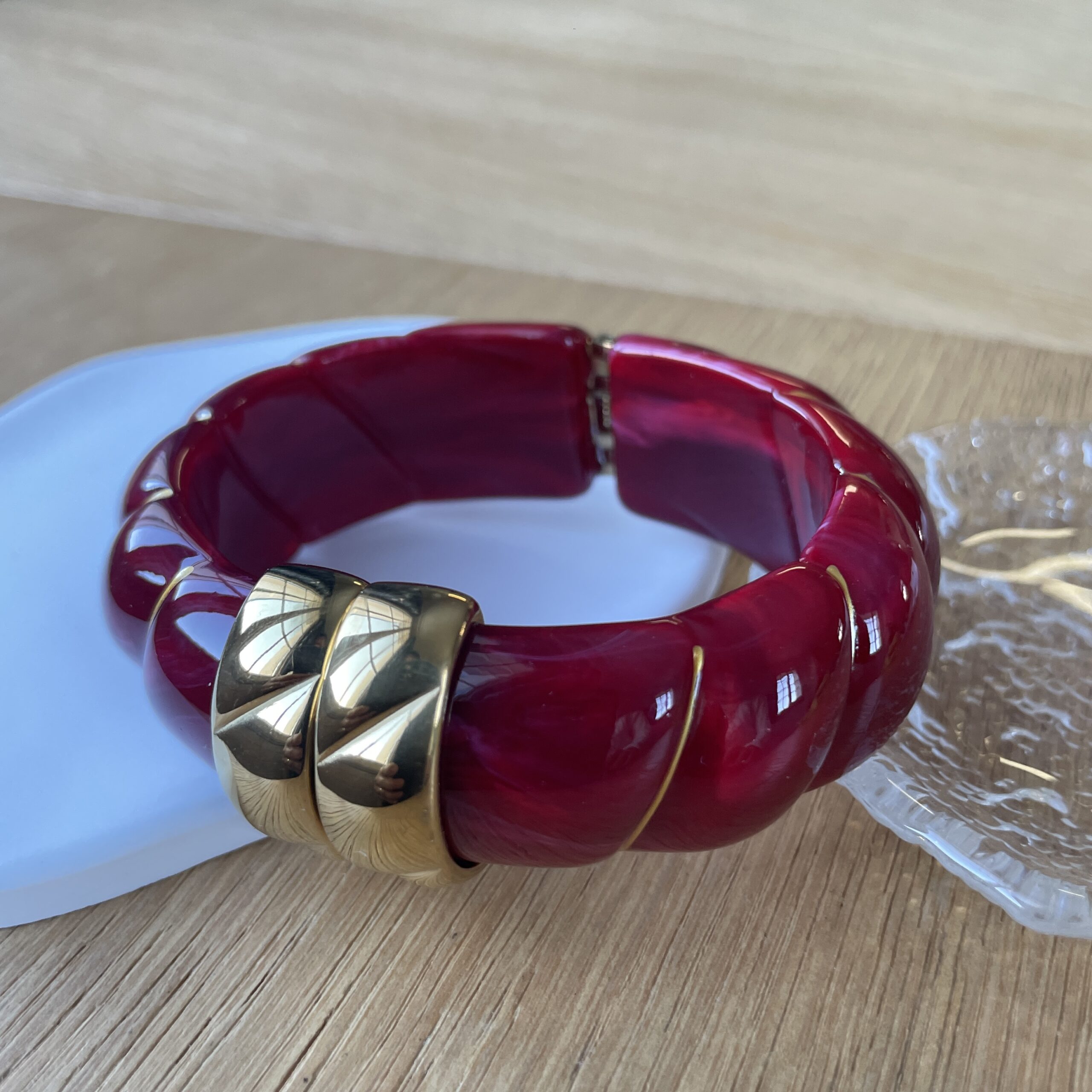 Sa résine brillante aux courbes sculptées capte la lumière, tandis que son fermoir doré apporte une touche chic et sophistiquée.