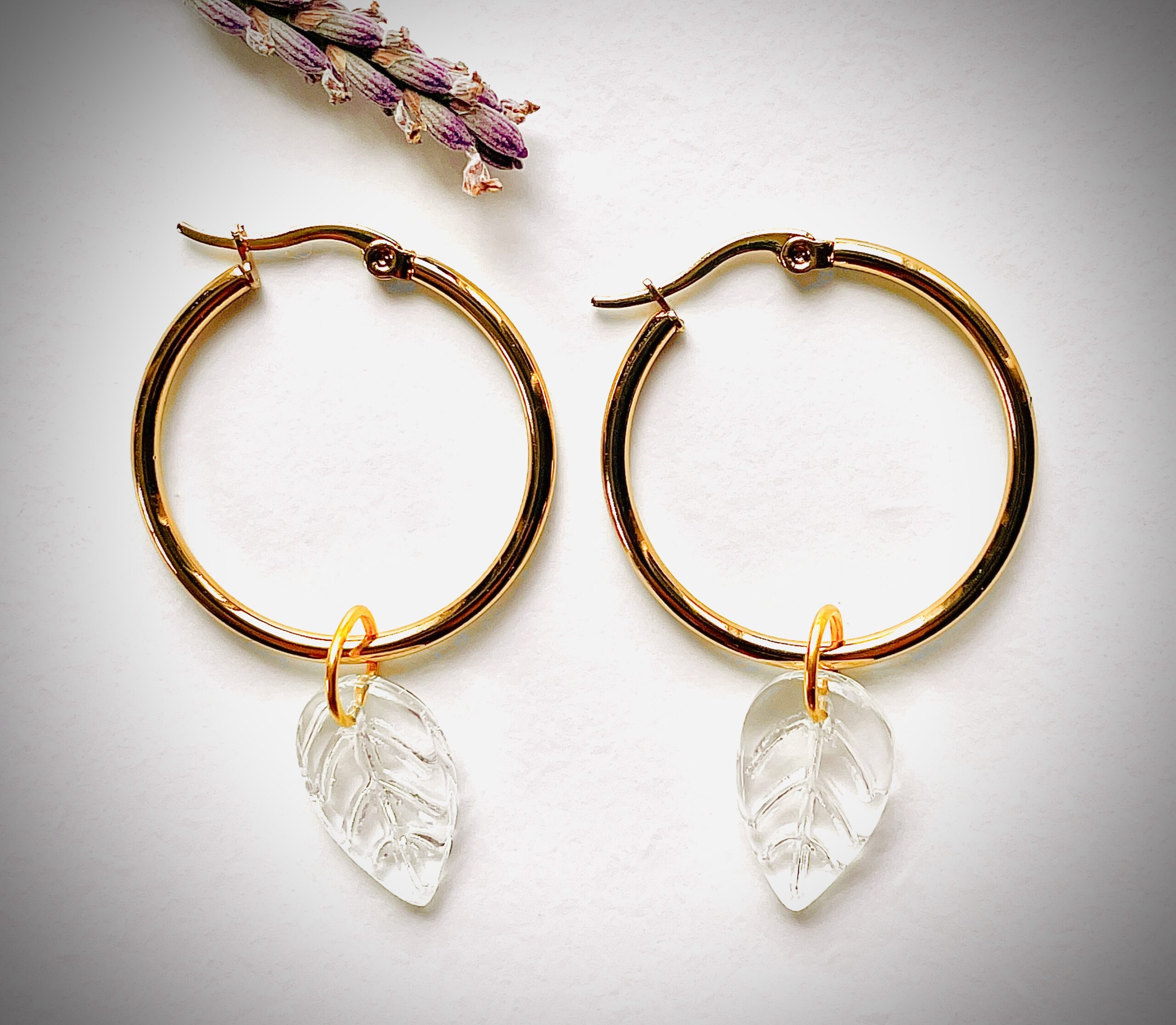 Élégantes créoles dorées, sublimées par un pendentif en forme de feuille transparente. Une création qui marie sobriété et raffinement, pensée pour celles qui aiment la discrétion tout en affirmant leur personnalité.