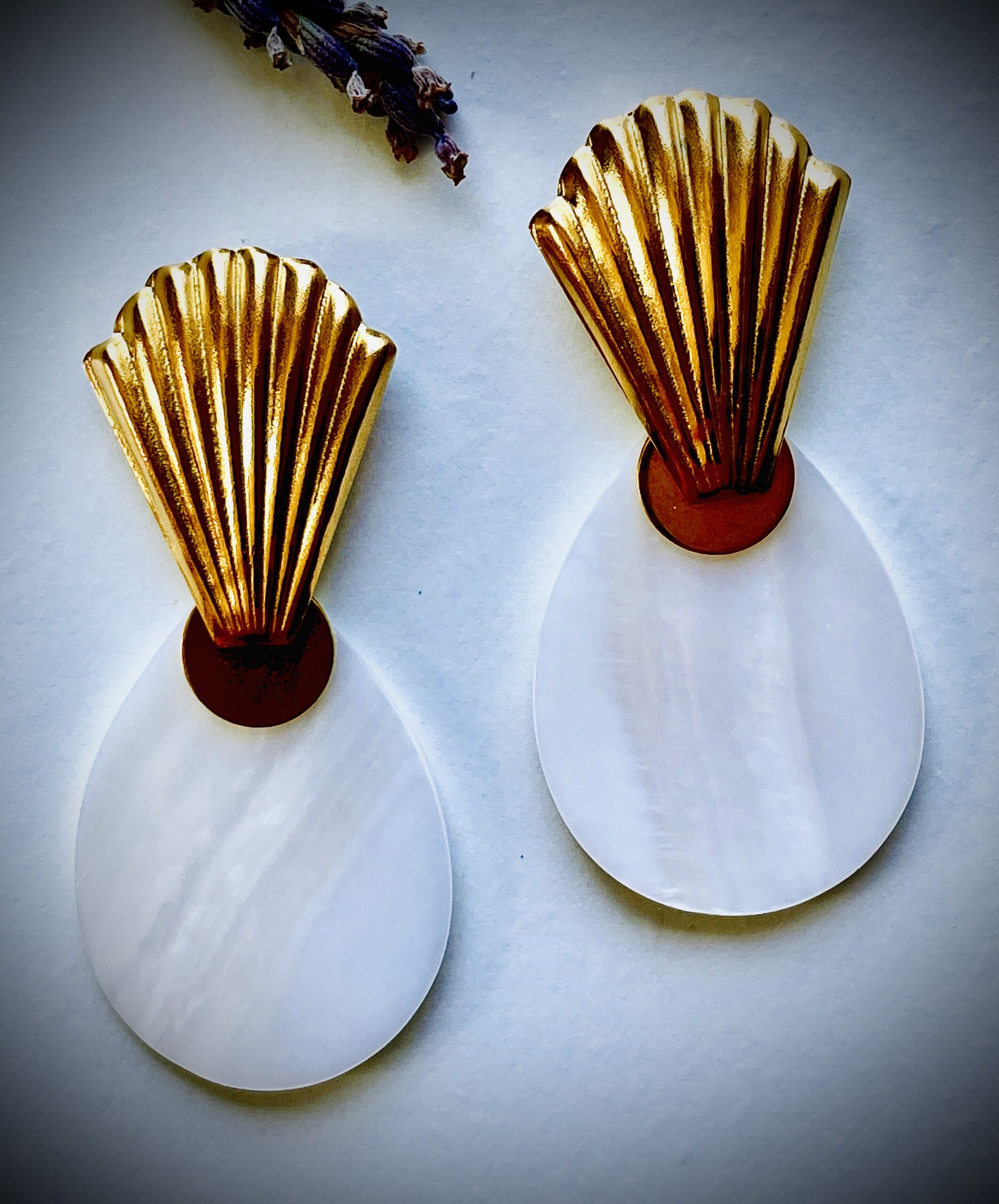Raffinées et intemporelles, les boucles Albane associent l’éclat d’un éventail doré à la douceur d’une pampille nacrée en forme de goutte. Leur design sobre et élégant reflète une féminité à la fois lumineuse et délicate.