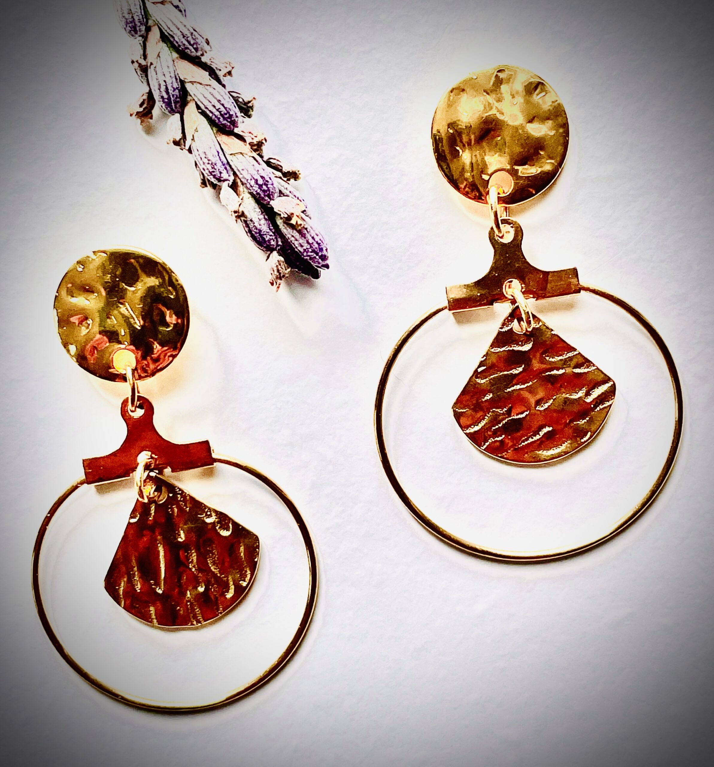 Modernes et lumineuses, les boucles Anna associent un disque doré martelé à un grand anneau fin orné d’une pampille texturée en forme d’éventail. Leur design raffiné, à la fois structuré et aérien, reflète une élégance contemporaine et affirmée.