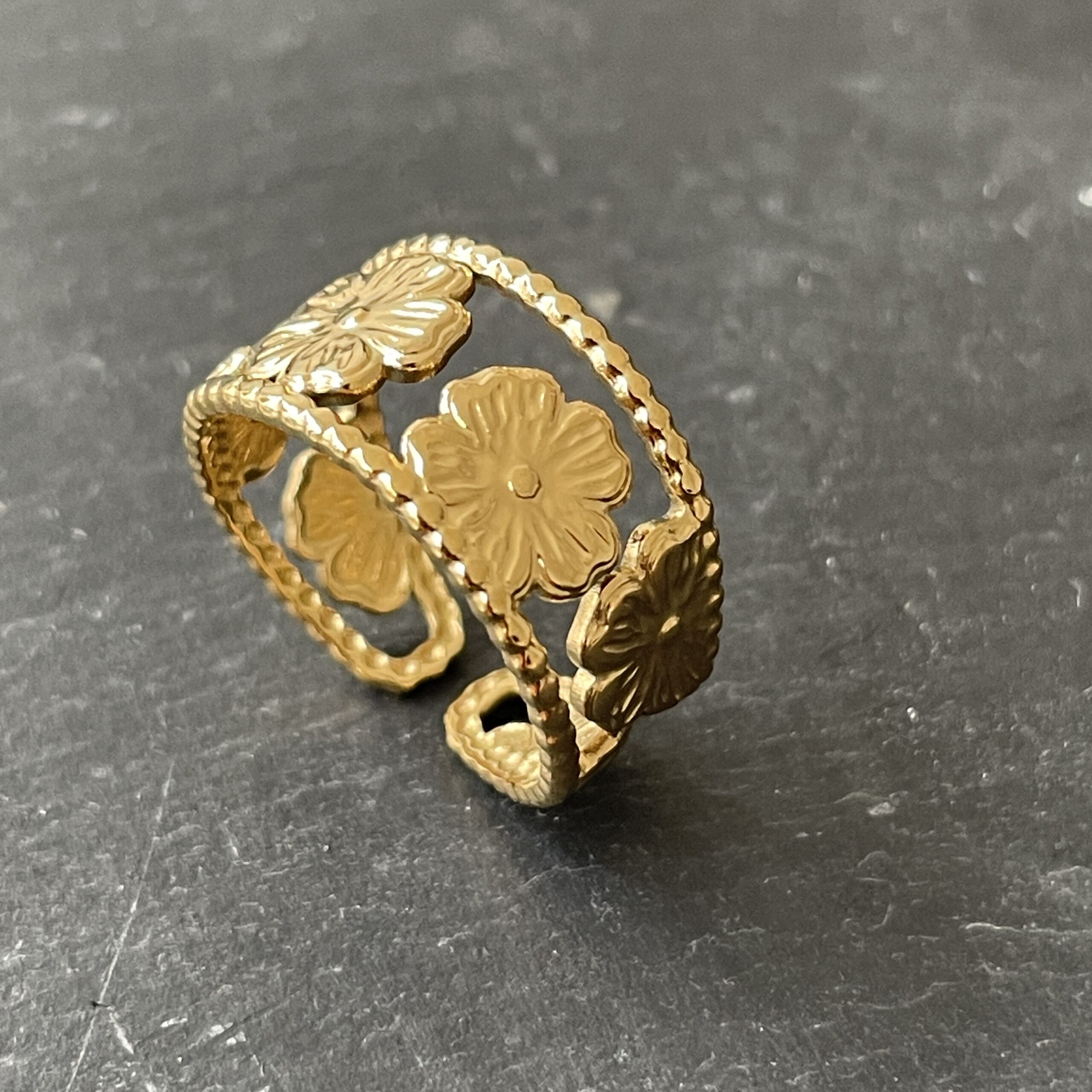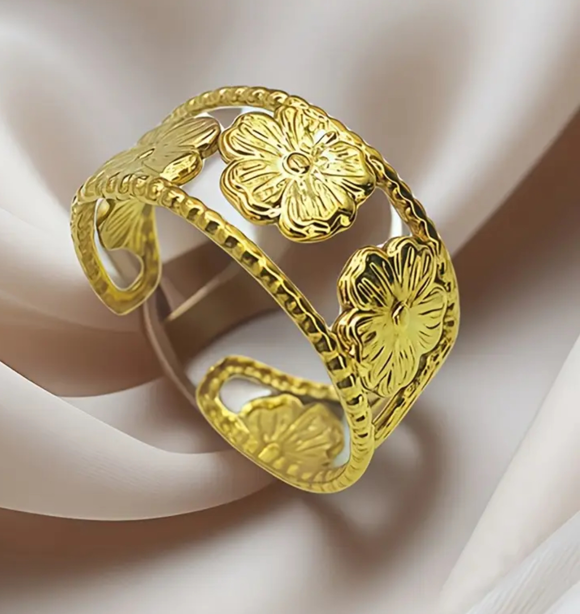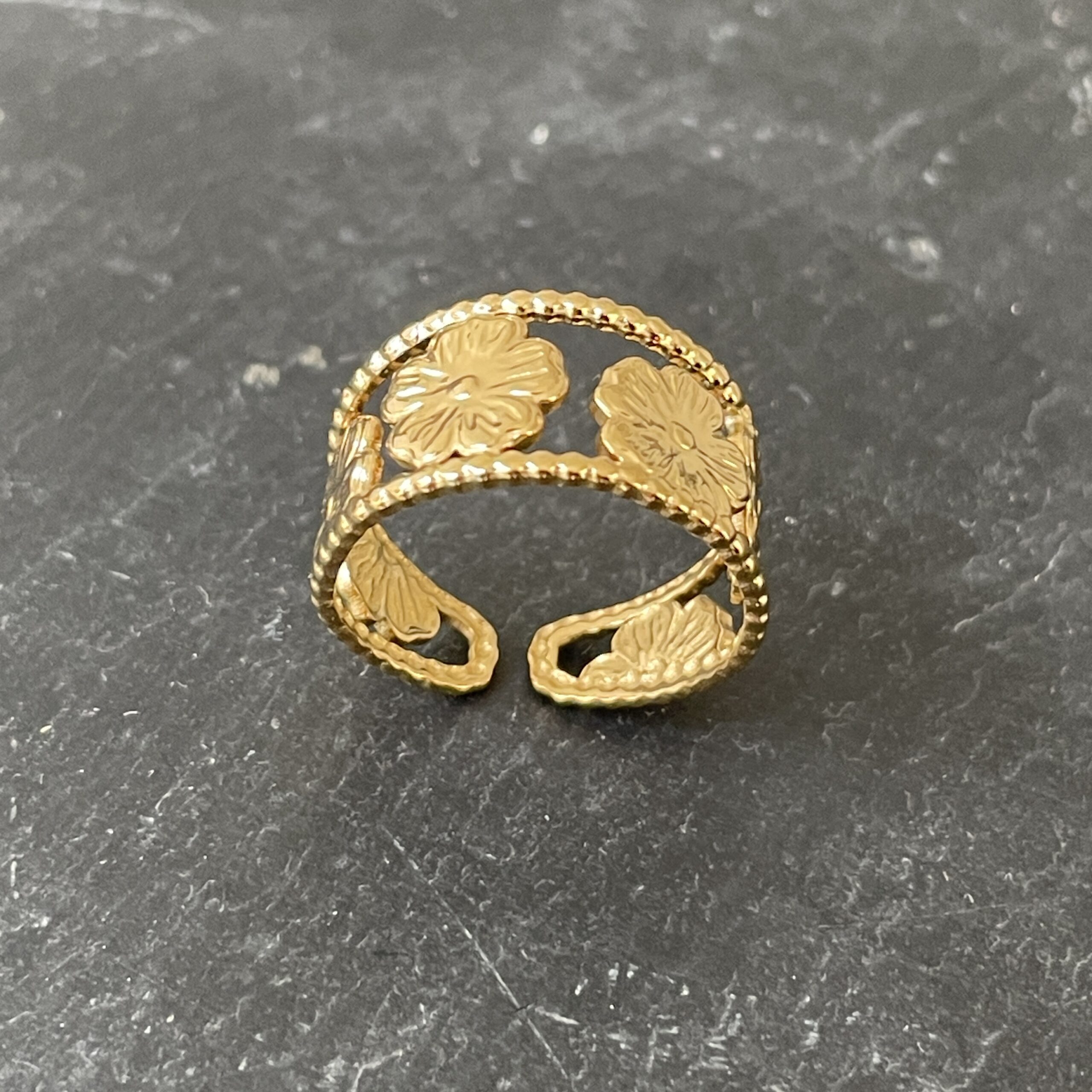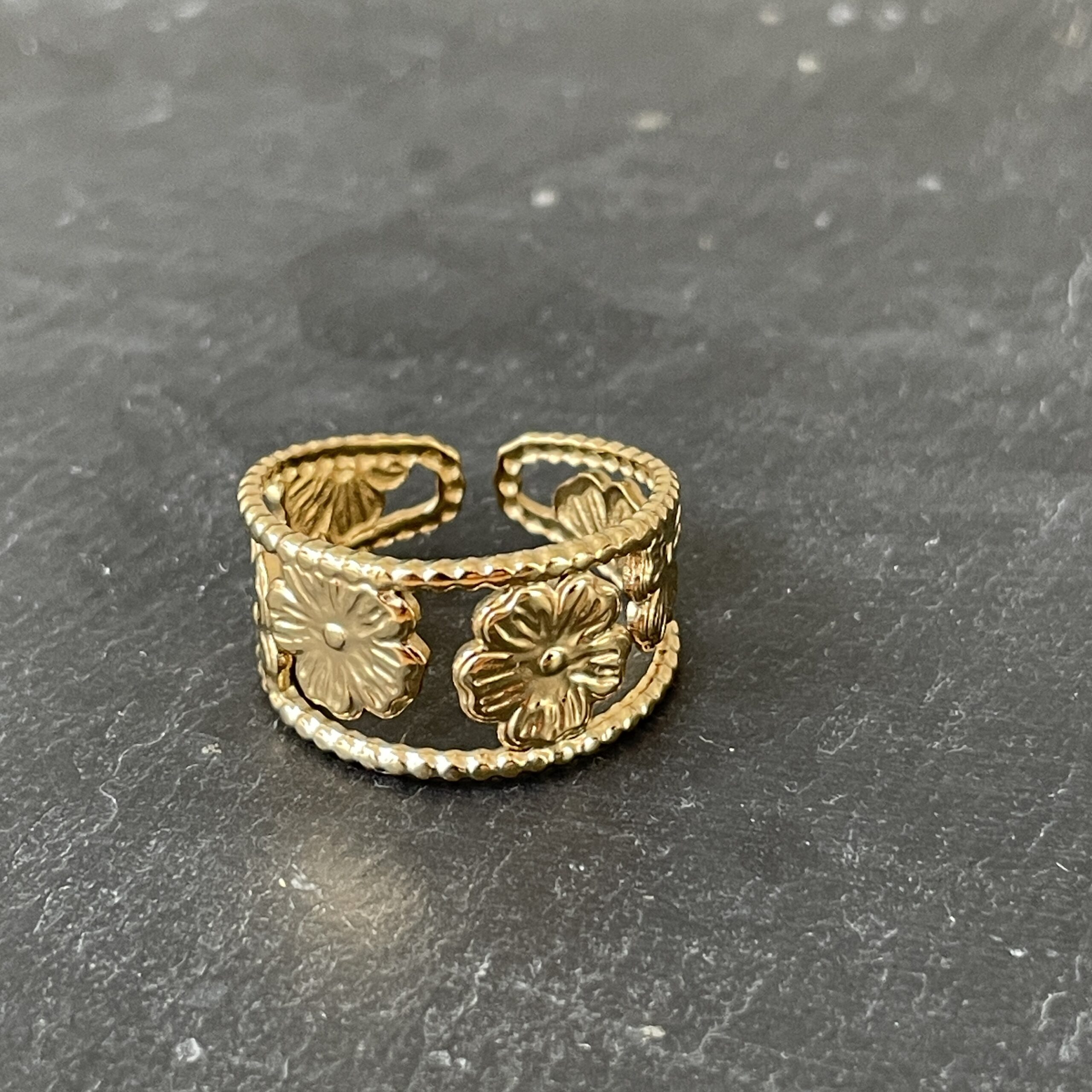 Son anneau ouvert, finement travaillé, est orné de petites fleurs sculptées aux reliefs délicats, évoquant un jardin précieux baigné de lumière.