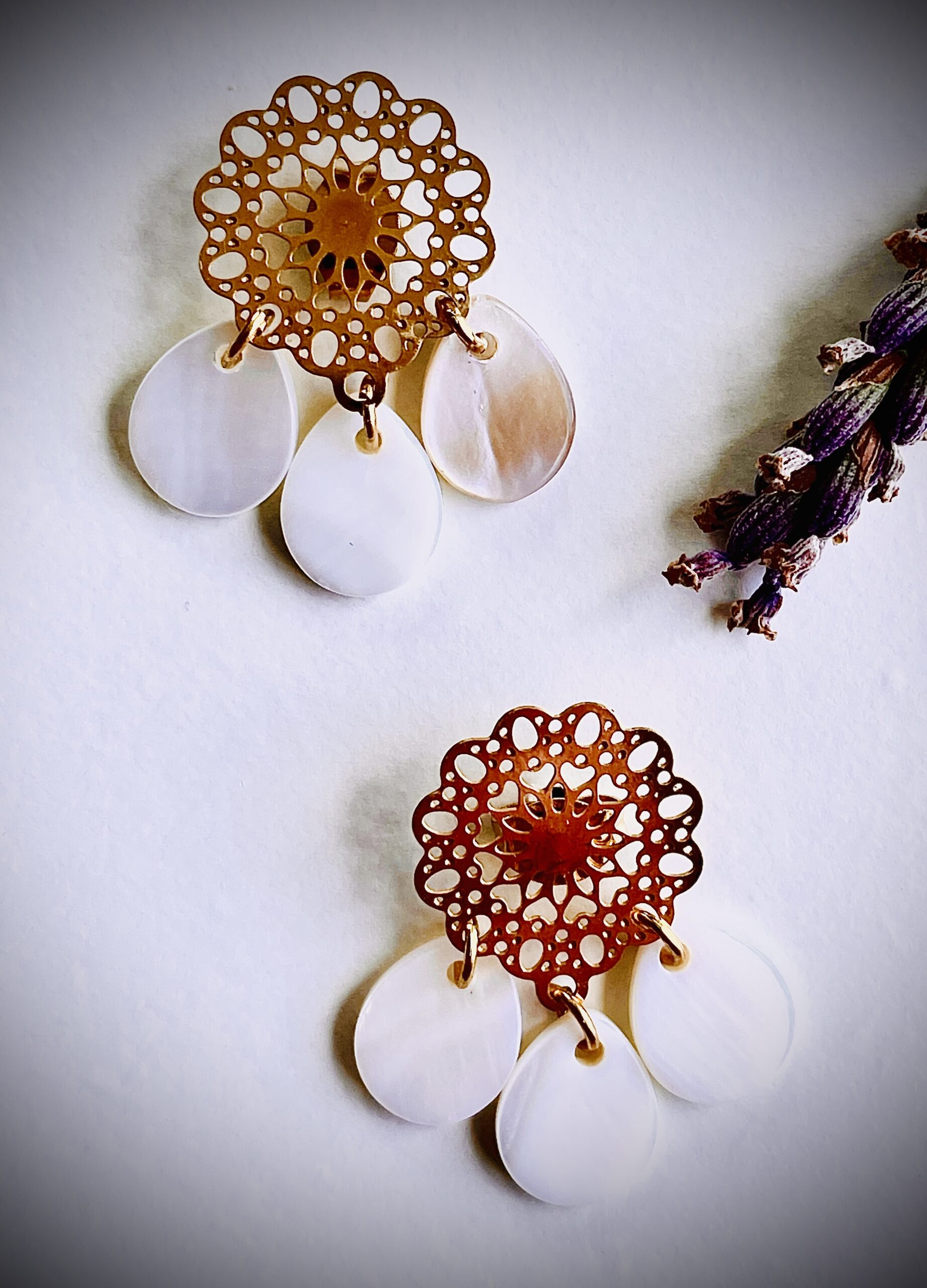 Les boucles Axelle se distinguent par leur monture dorée finement ajourée façon dentelle, sublimée par trois pampilles en nacre blanche en forme de gouttes. Légères, élégantes et lumineuses, elles ajoutent une touche de raffinement et de fantaisie à toutes vos tenues.