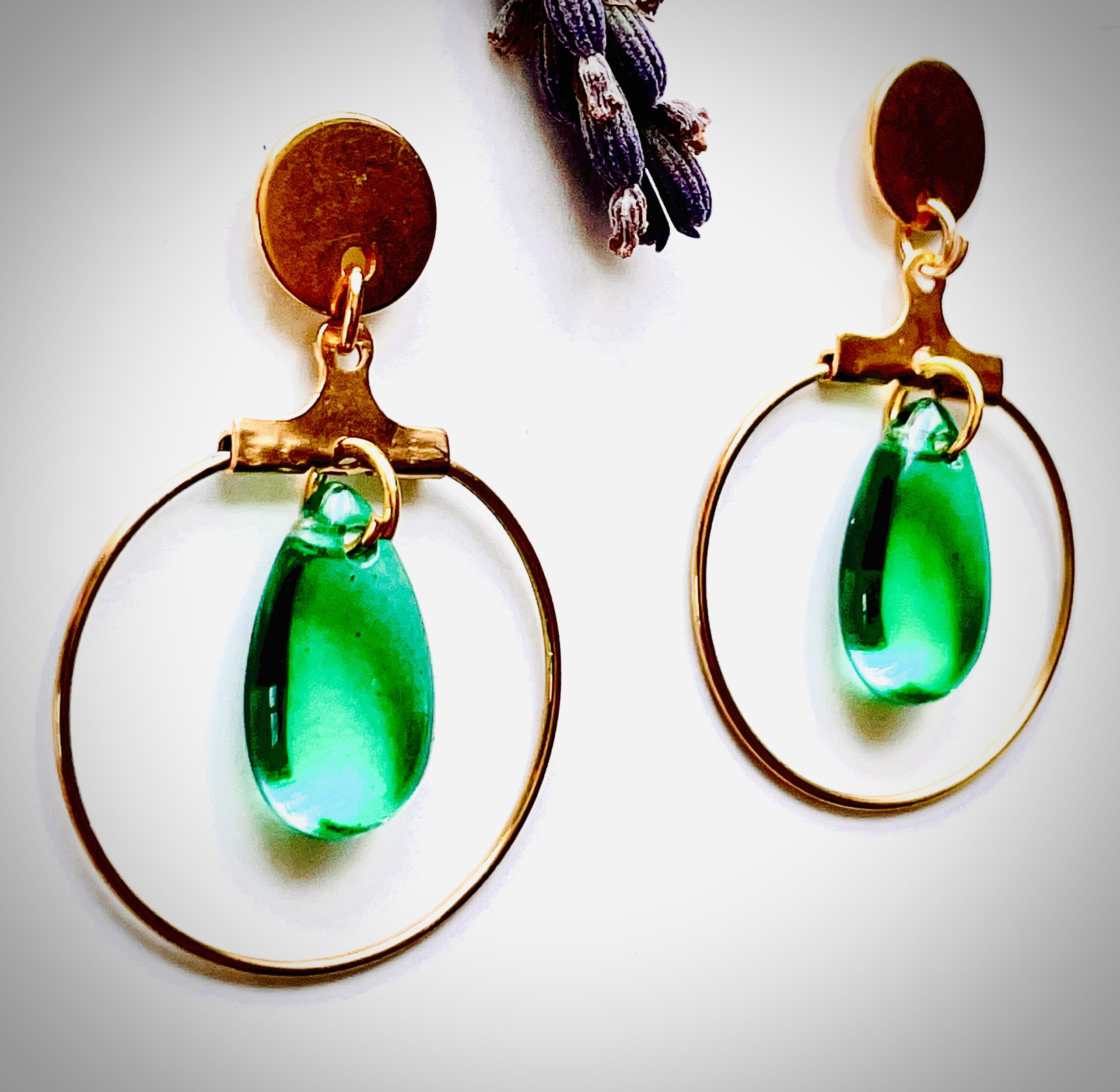 Le modèle Béatrice allie force et élégance avec ses cercles dorés fins rehaussés d’une goutte de verre émeraude éclatante. Ces boucles incarnent l’énergie déterminée et la concentration, tout en gardant une aura de raffinement.