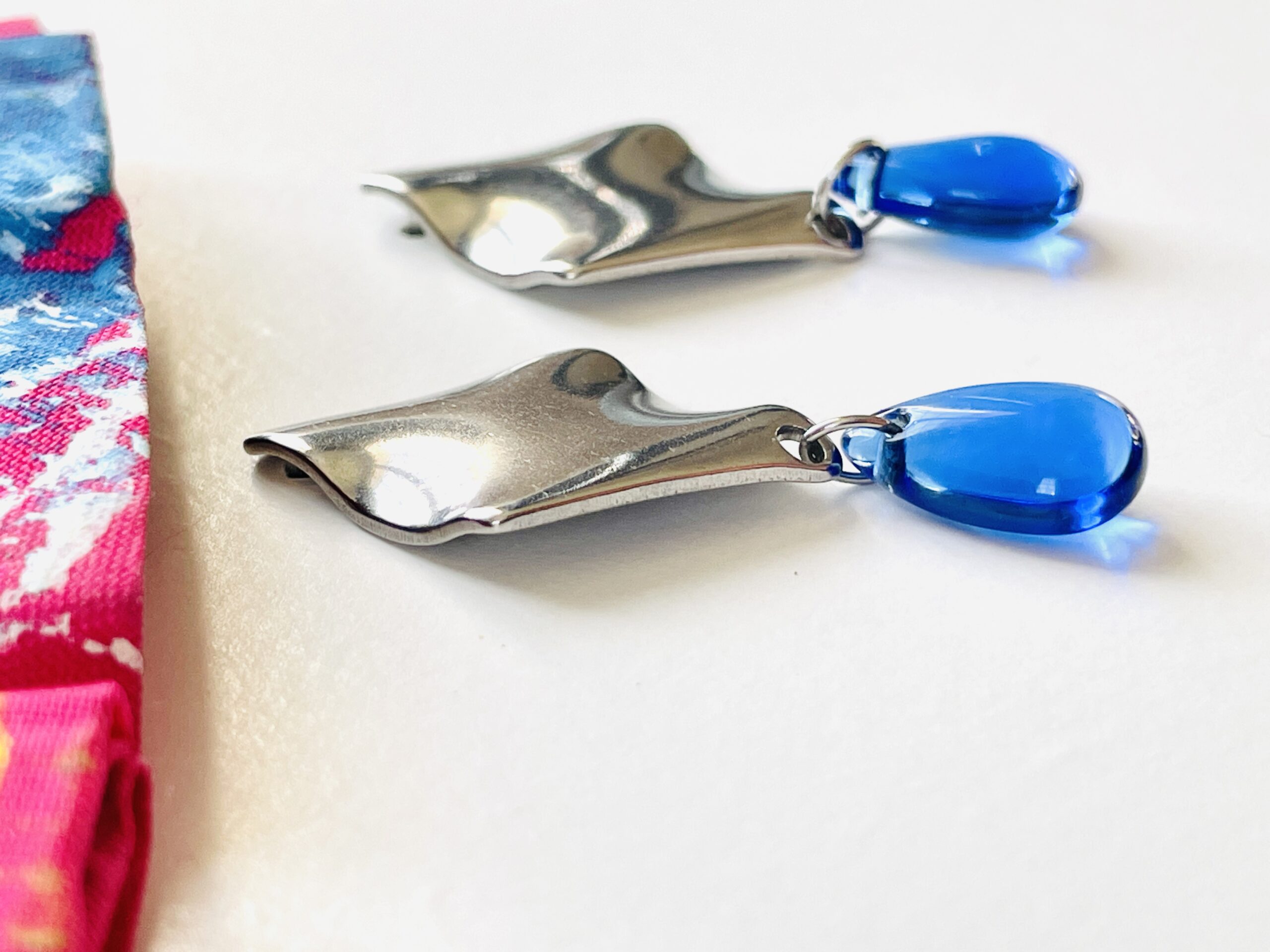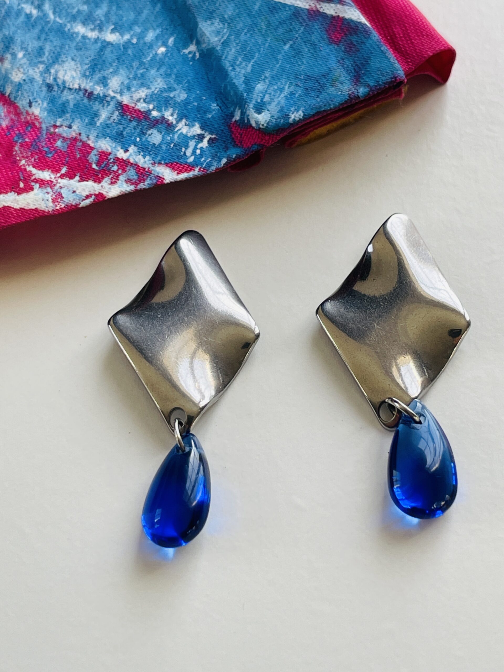 Un losange martelé aux reflets métalliques capte la lumière et met en valeur une élégante goutte bleue translucide suspendue.