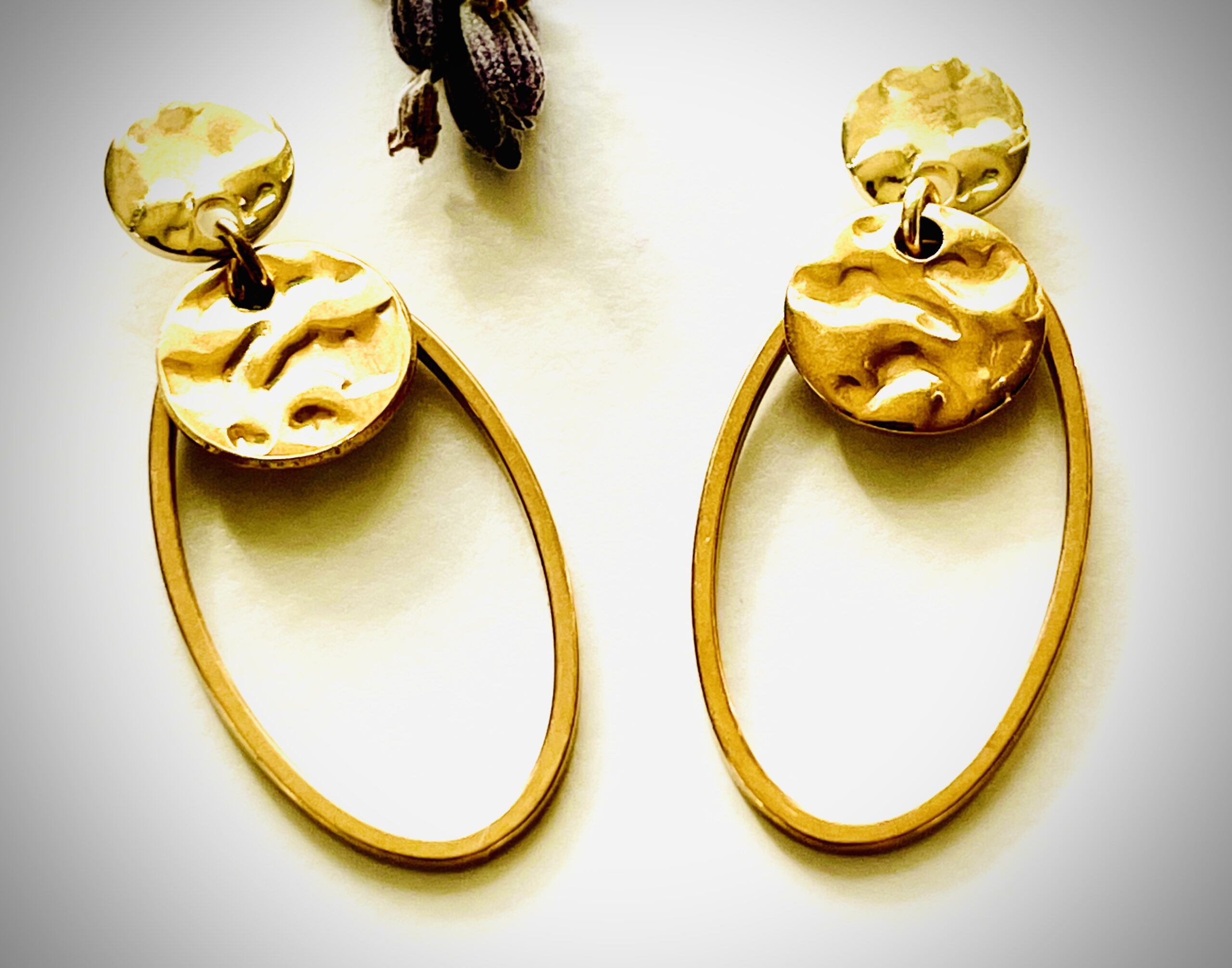 Le modèle Camille se distingue par son design doré et élégant : un disque martelé qui capte la lumière, prolongé d’un ovale fin et moderne. Ces boucles allient délicatesse et caractère.