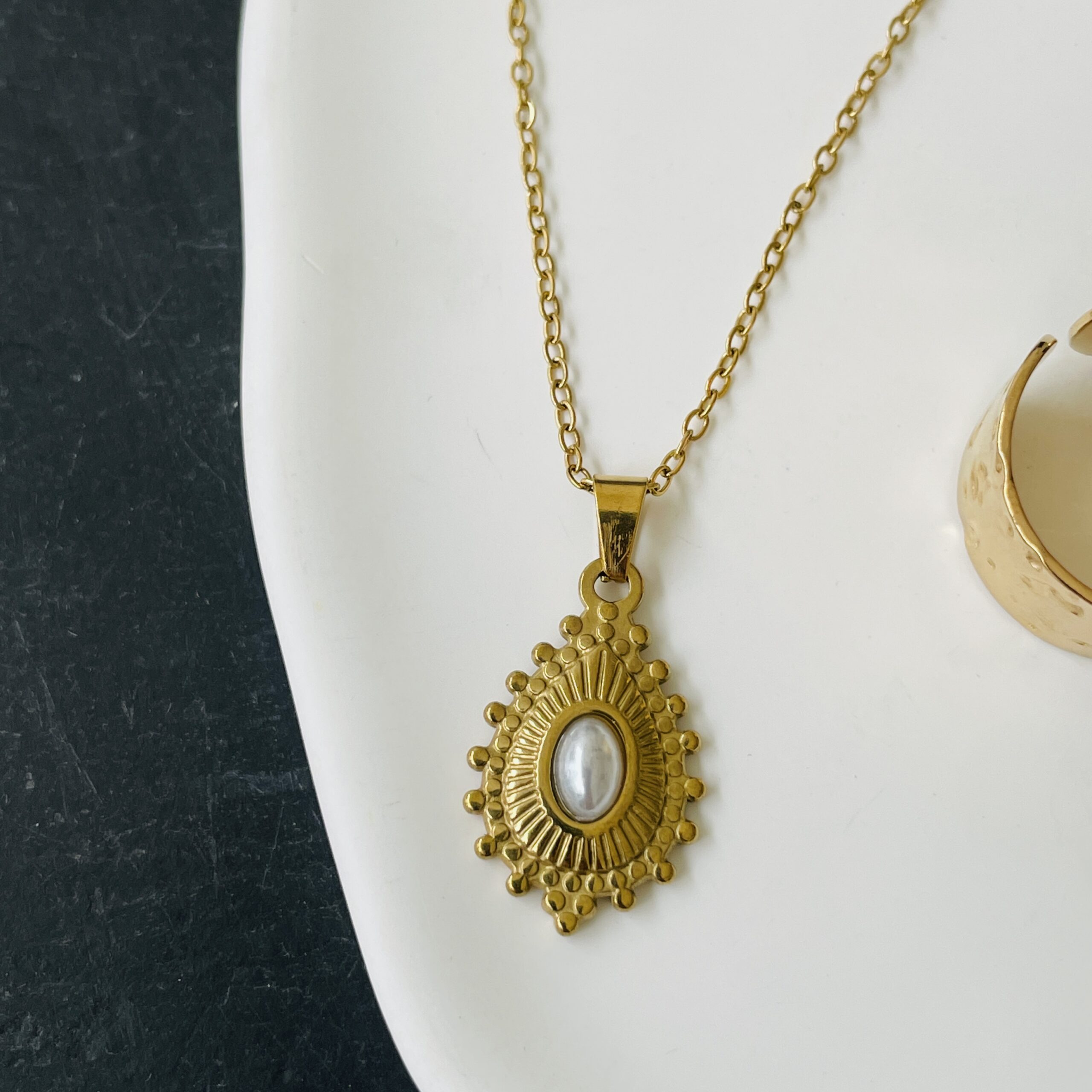 Sa chaîne dorée délicate équilibre parfaitement le caractère du pendentif, faisant de Constance un bijou aussi raffiné que facile à porter.