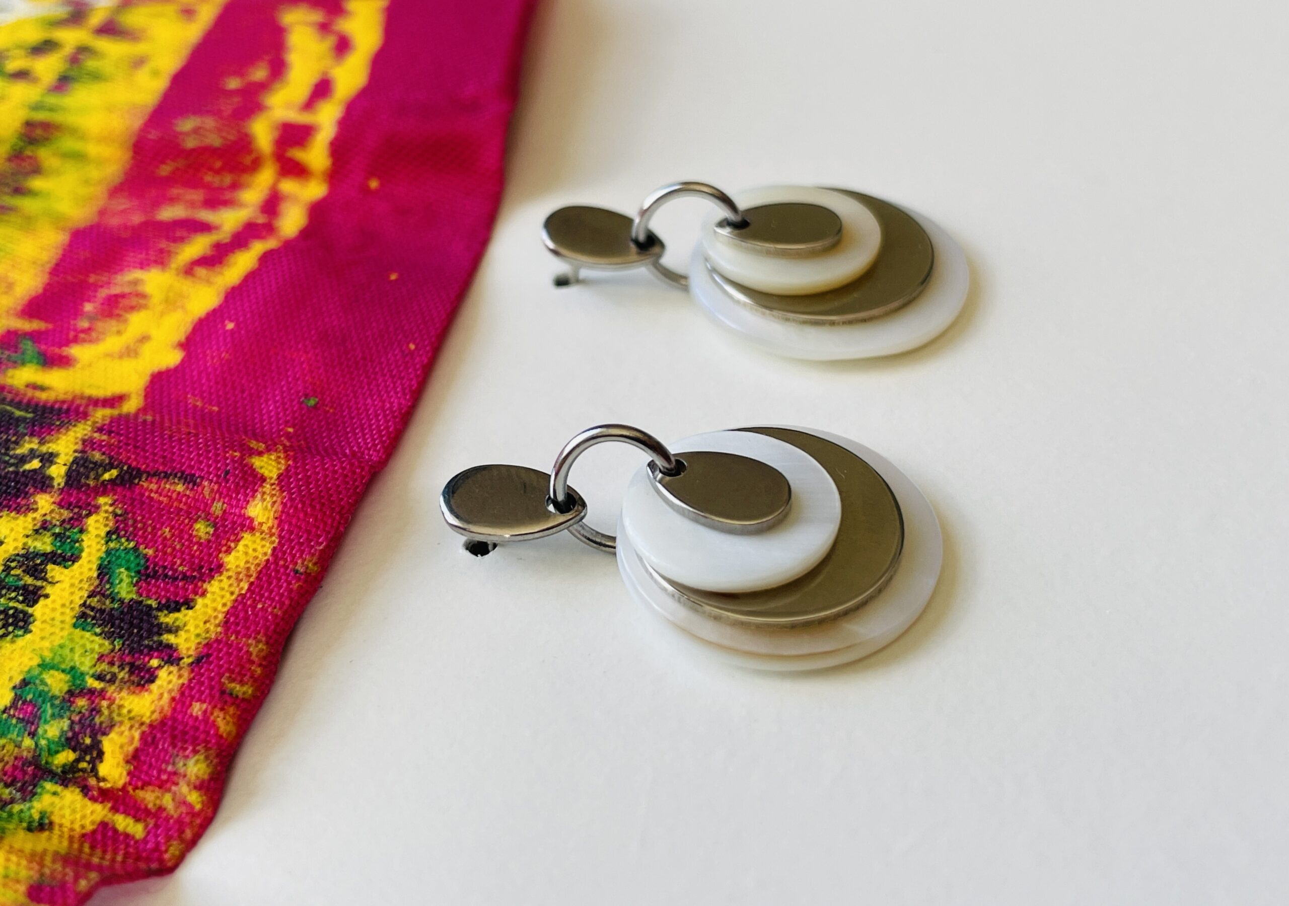 Boucles d’oreilles en acier inoxydable et nacre, composées de cercles superposés aux reflets doux et lumineux.