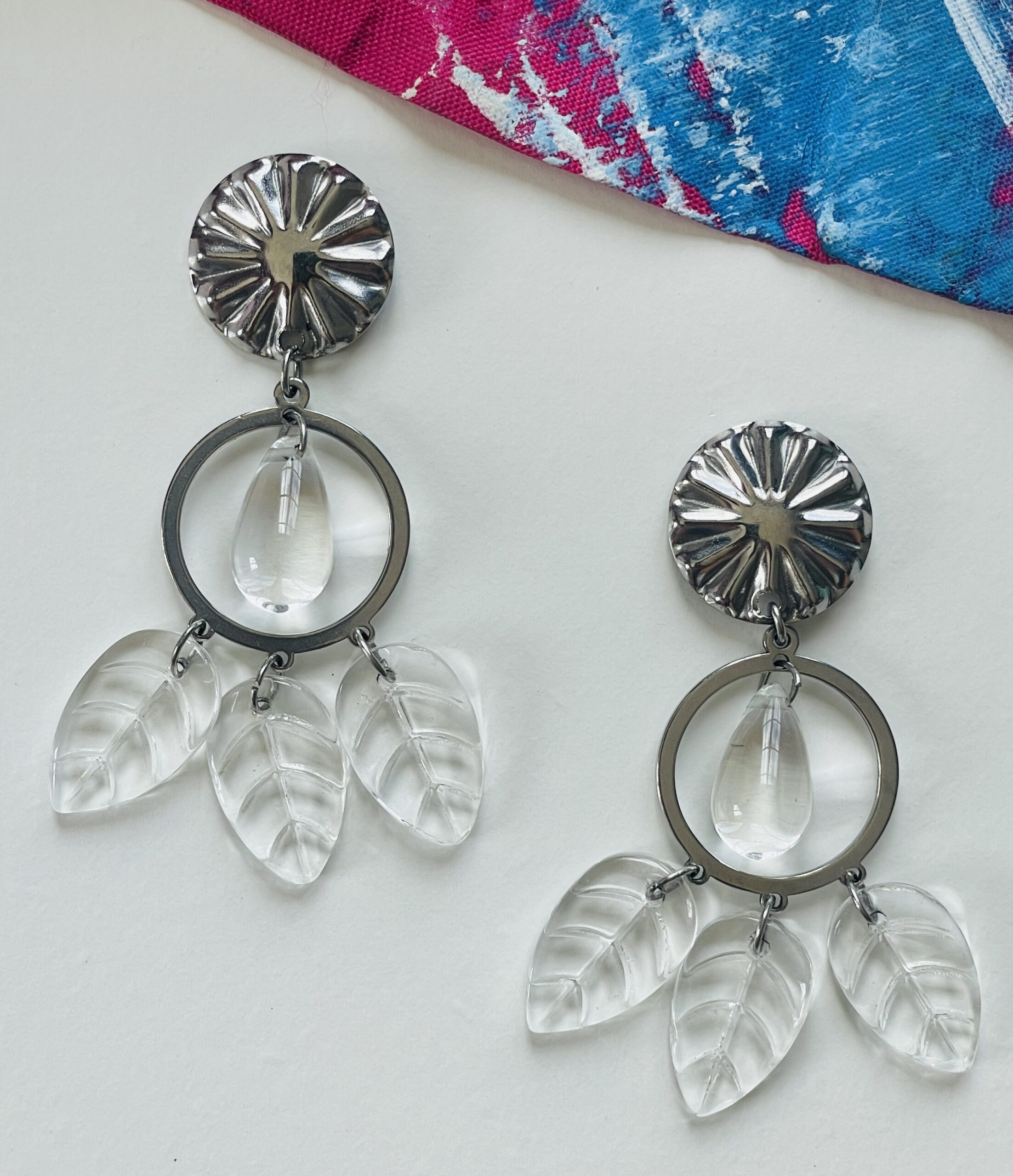 Boucles d’oreilles en acier inoxydable ornées d’un cercle fin et de pampilles translucides en forme de gouttes et de feuilles.