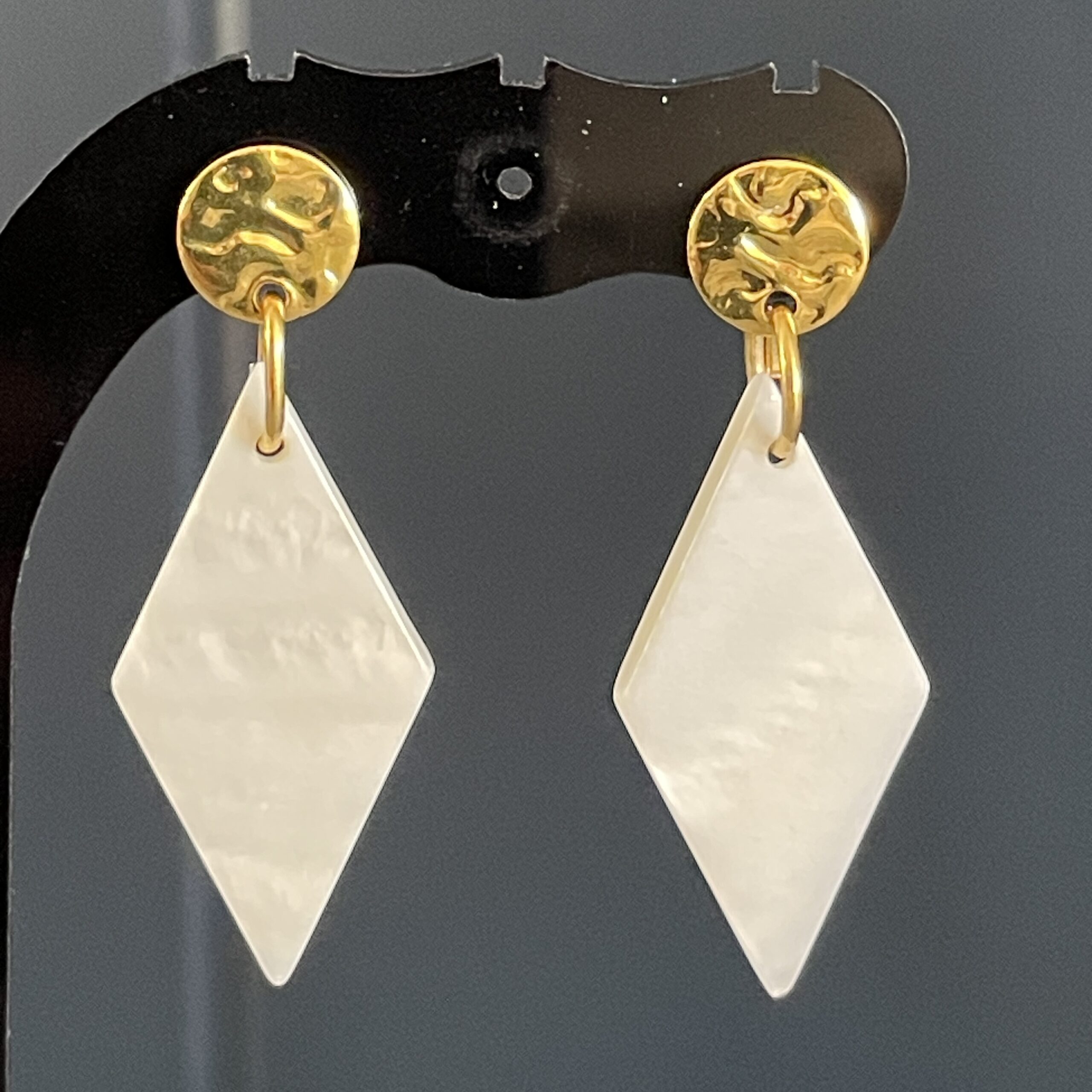 🌼Les boucles d’oreilles Élina séduisent par leur élégance graphique et leur douceur lumineuse. Leur pendentif en forme de losange, à l’aspect nacré et délicatement marbré, capte la lumière avec subtilité et apporte une touche raffinée au visage.