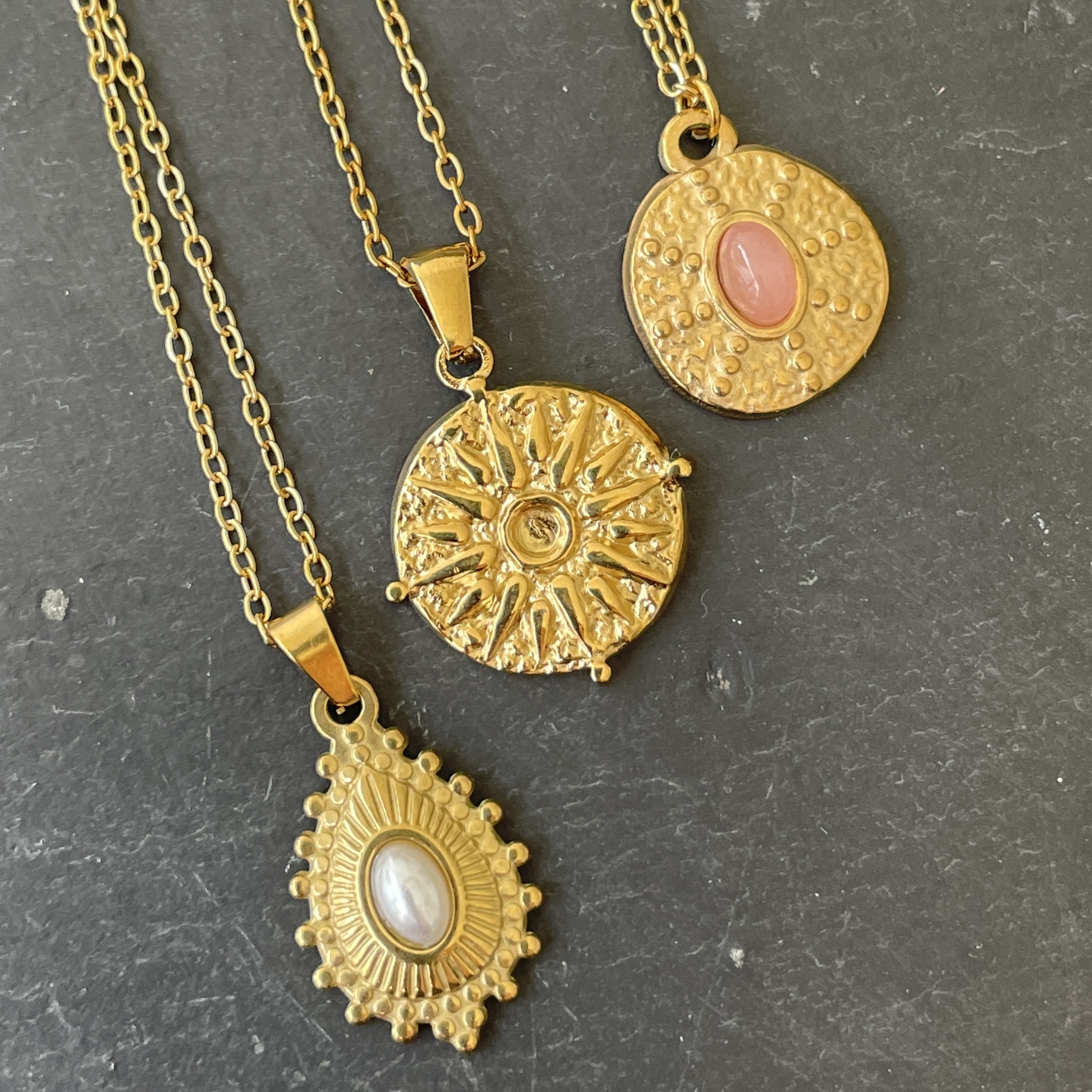 Chic et rayonnant, le collier Évelyne attire tous les regards par son médaillon solaire finement travaillé.
