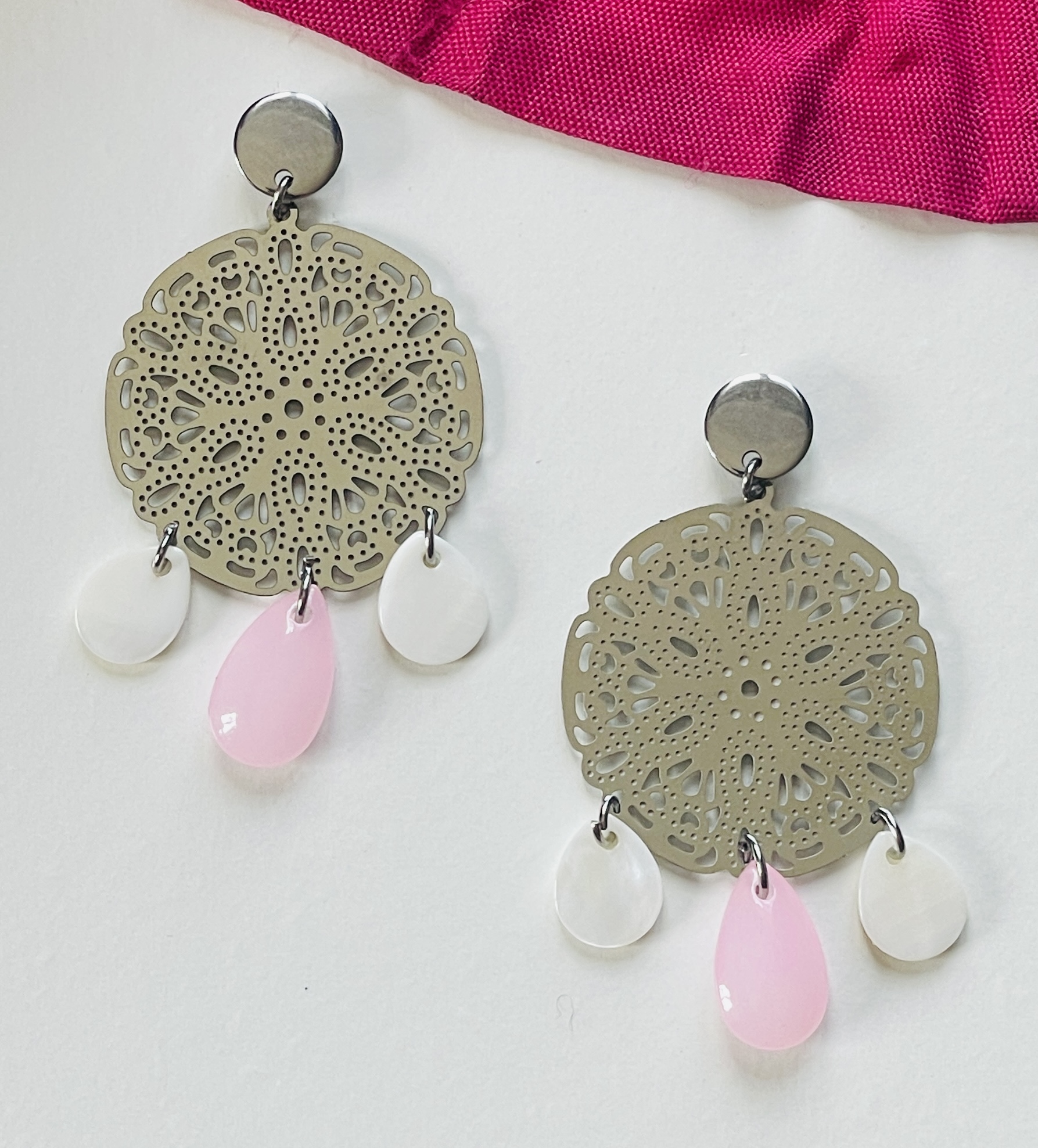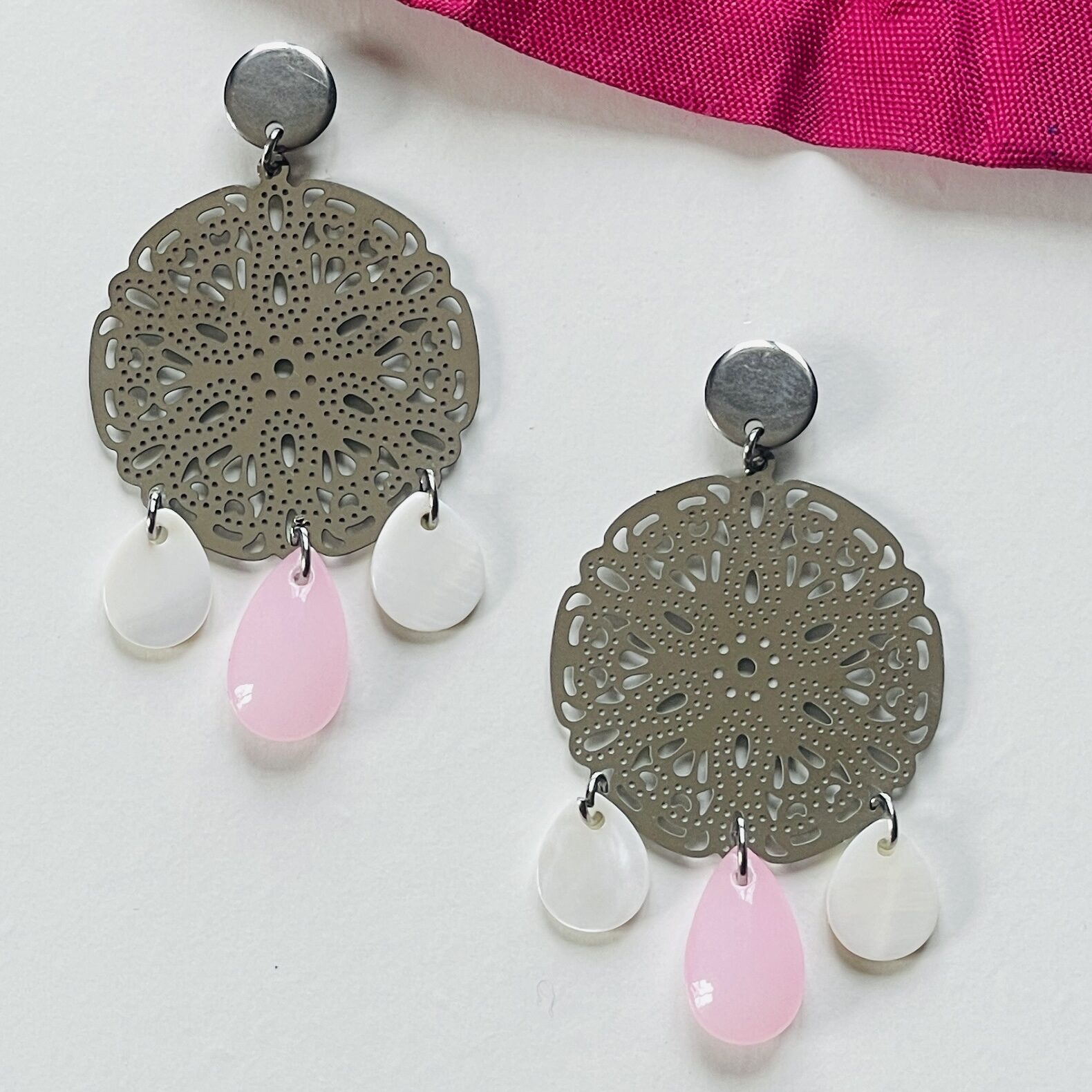 Des boucles d’oreilles tout en douceur, composées d’un grand médaillon ajouré en acier et de pampilles nacrées et rose tendre en forme de gouttes.