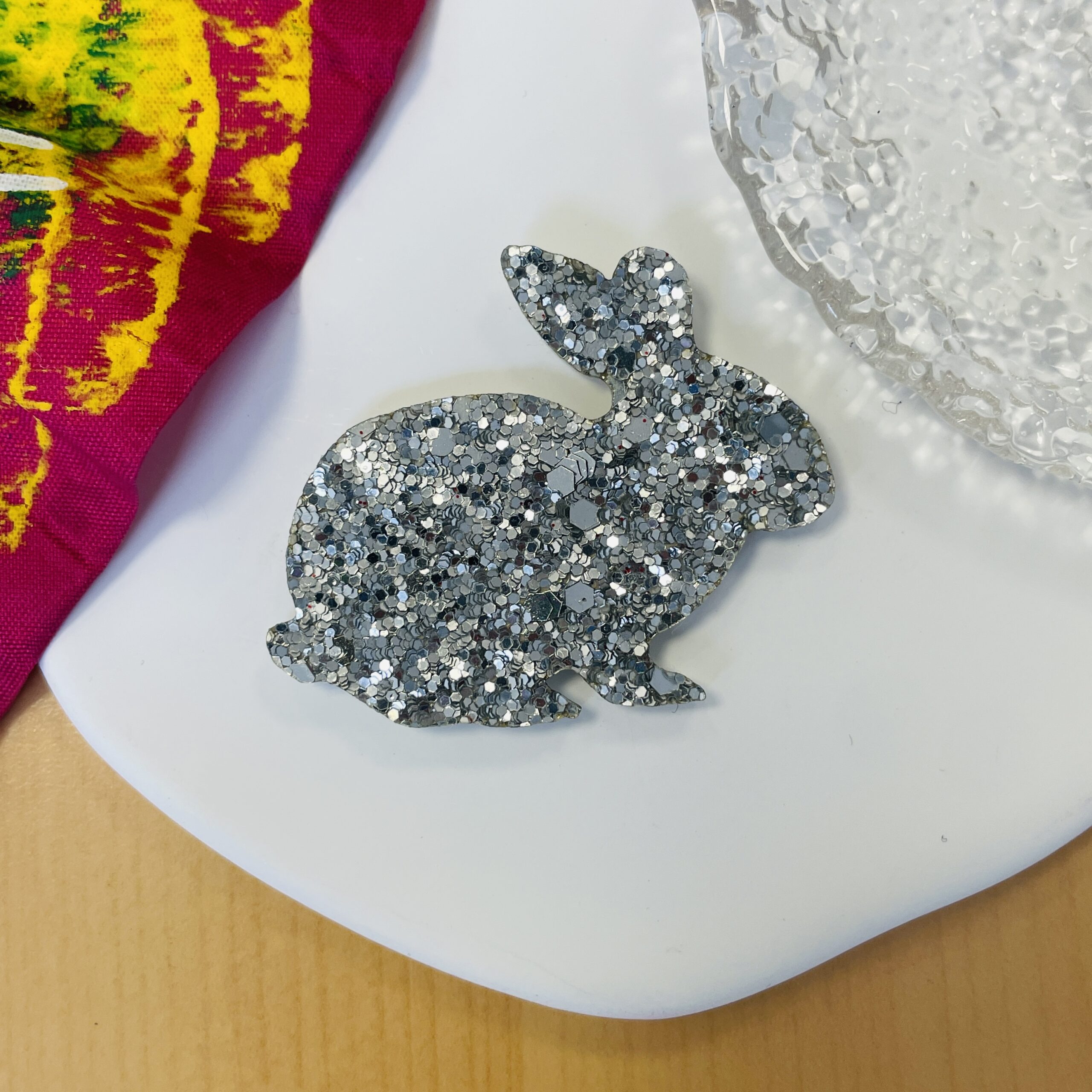 Délicate et pleine de poésie, cette broche en forme de lapin charme par son fini argenté subtilement pailleté. Symbole de douceur, de chance et de renouveau, elle évoque la tendresse et l’élégance avec une touche de fantaisie.