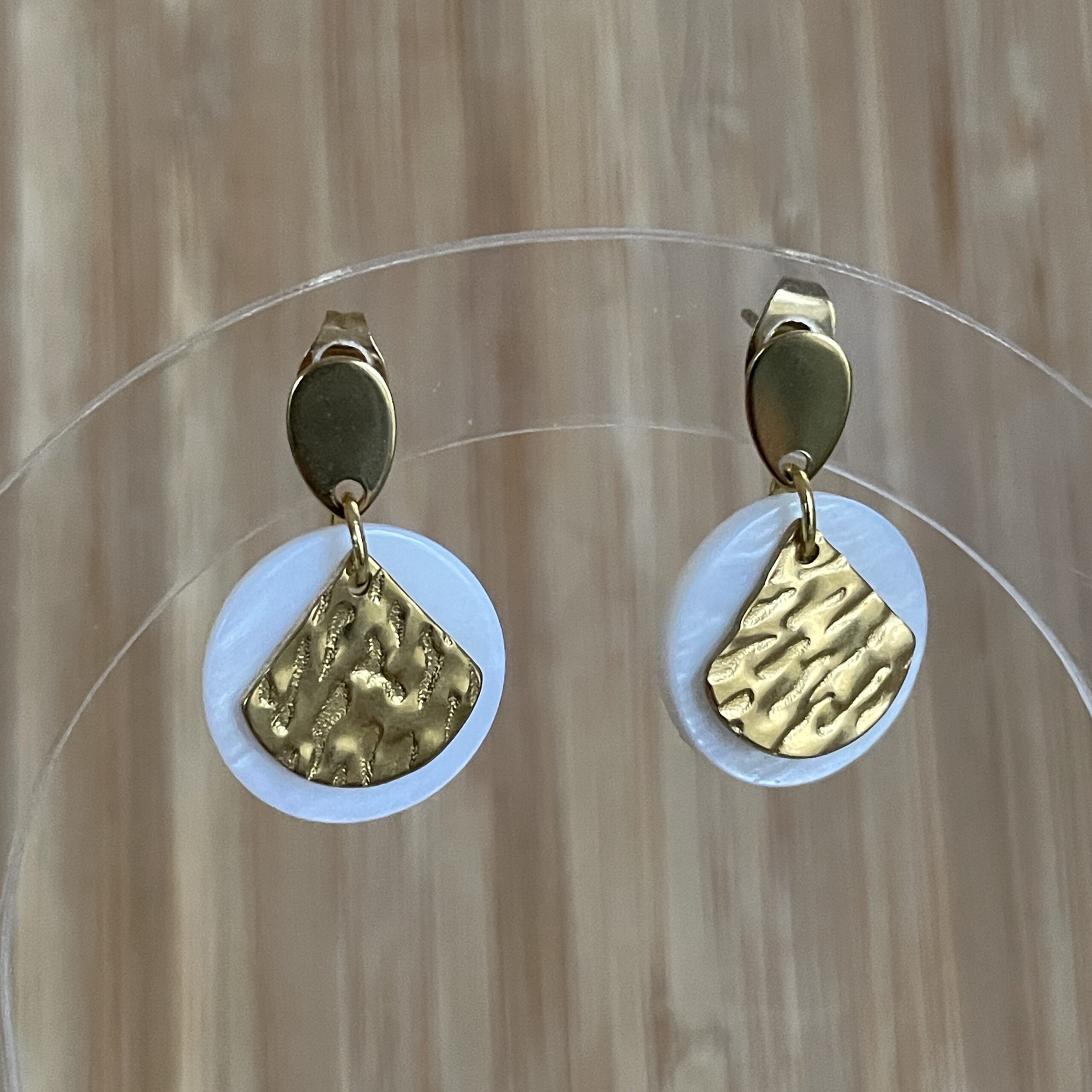 Douces et lumineuses, ces boucles jouent sur l’équilibre entre la rondeur nacrée et la texture martelée du doré. Leur design délicat capte subtilement la lumière et évoque une élégance apaisante, presque céleste. Un bijou facile à porter, à la fois discret et raffiné.