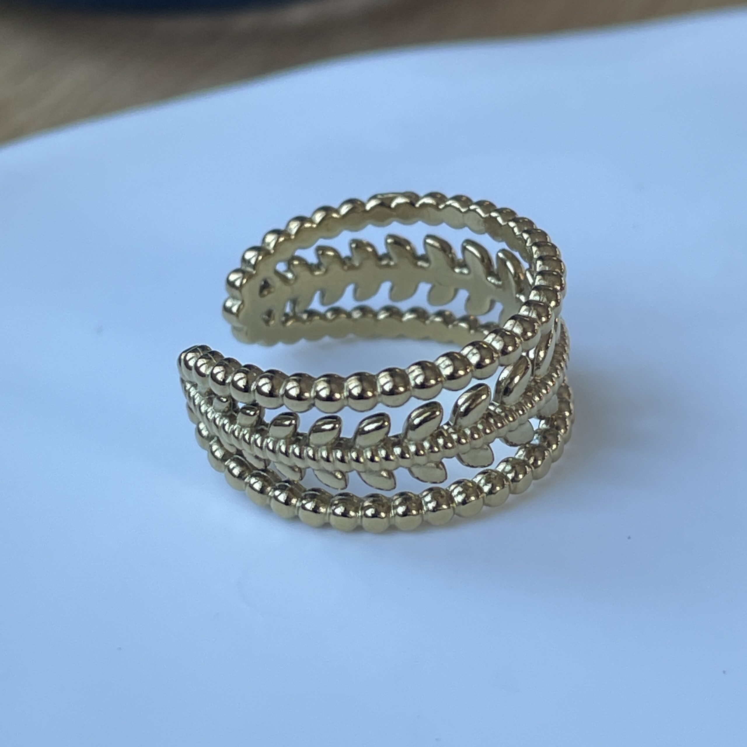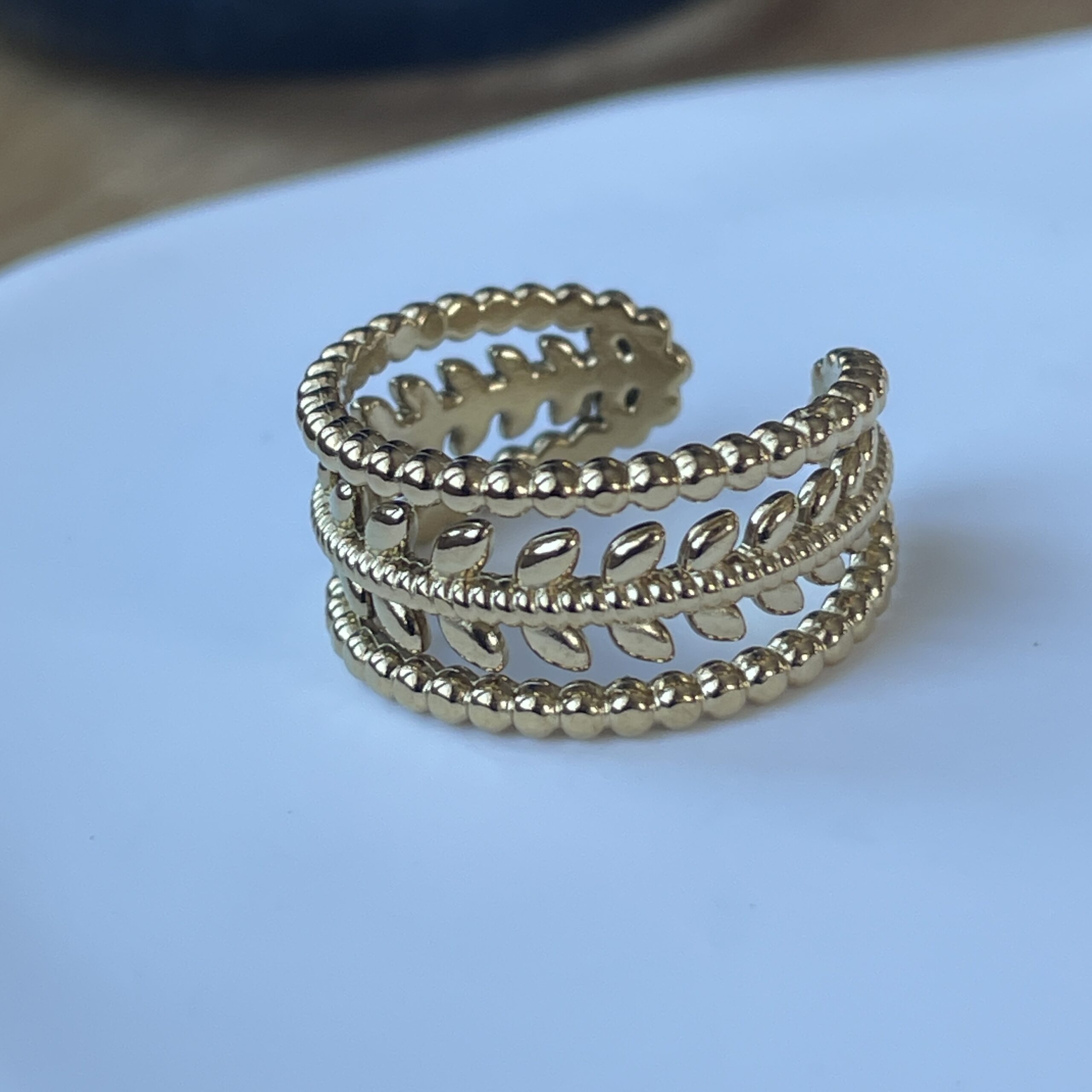 Délicate et pleine de caractère, la bague Nélia séduit par son design travaillé et son esprit végétal. Composée de plusieurs rangs dorés finement perlés et ornés de petits motifs en forme de feuilles, elle crée un élégant jeu de textures et de reflets autour du doigt.