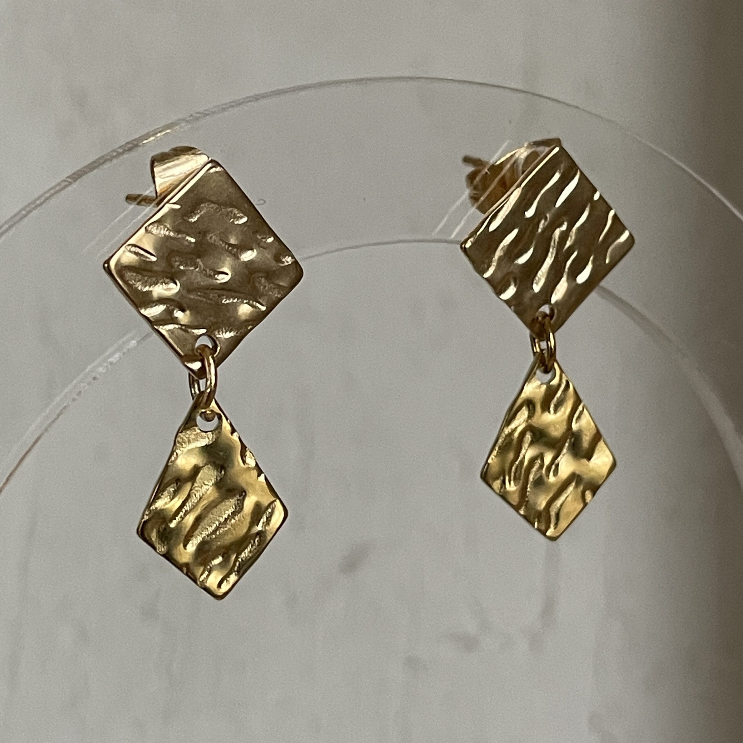 Graphiques et élégantes, ces boucles jouent sur la superposition de formes géométriques aux textures martelées. Leur design structuré, sublimé par un doré lumineux, apporte du caractère tout en restant facile à porter. Un bijou affirmé, moderne et intemporel.