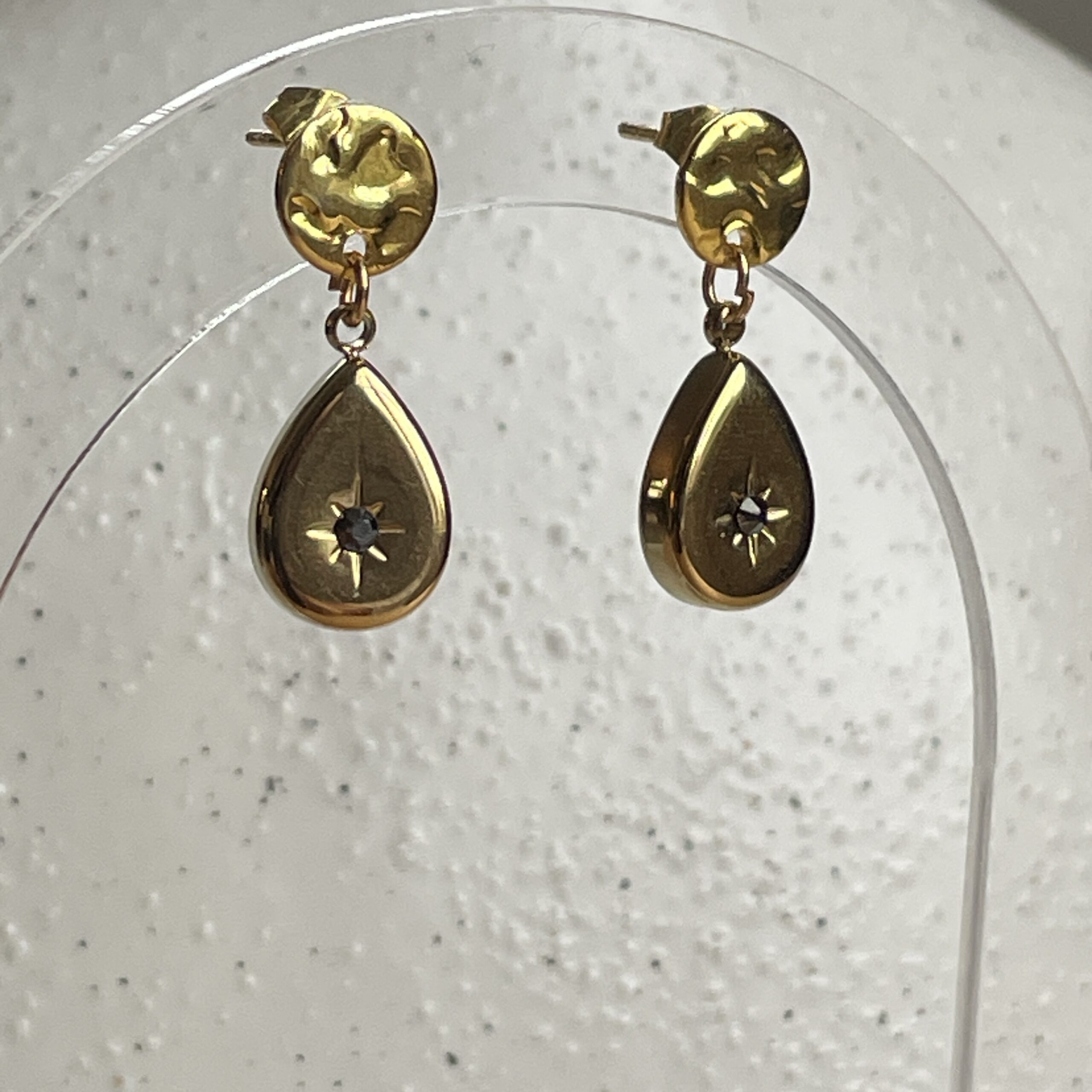 Élégantes et lumineuses, ces boucles séduisent par leur design délicat en forme de goutte, sublimé par un détail central étincelant. Le métal doré, à la fois lisse et subtilement texturé, capte la lumière avec finesse pour un rendu chic et intemporel.