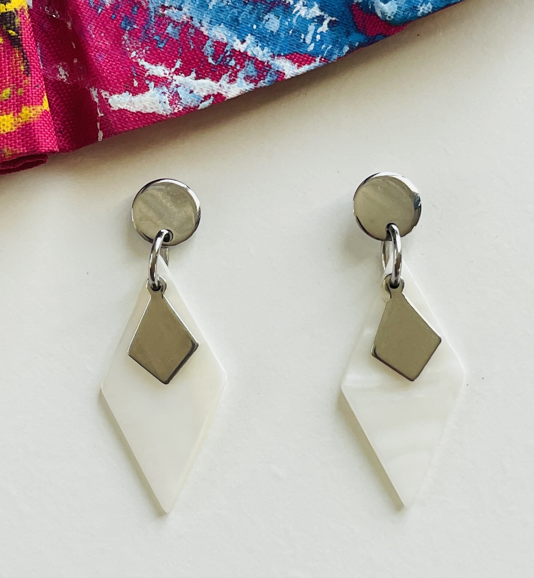 Ces boucles d’oreilles géométriques, alliant le métal argenté et la nacre éclatante, s’inspirent de Pleubian, commune des Côtes-d’Armor, située à l’extrémité nord de la Bretagne.