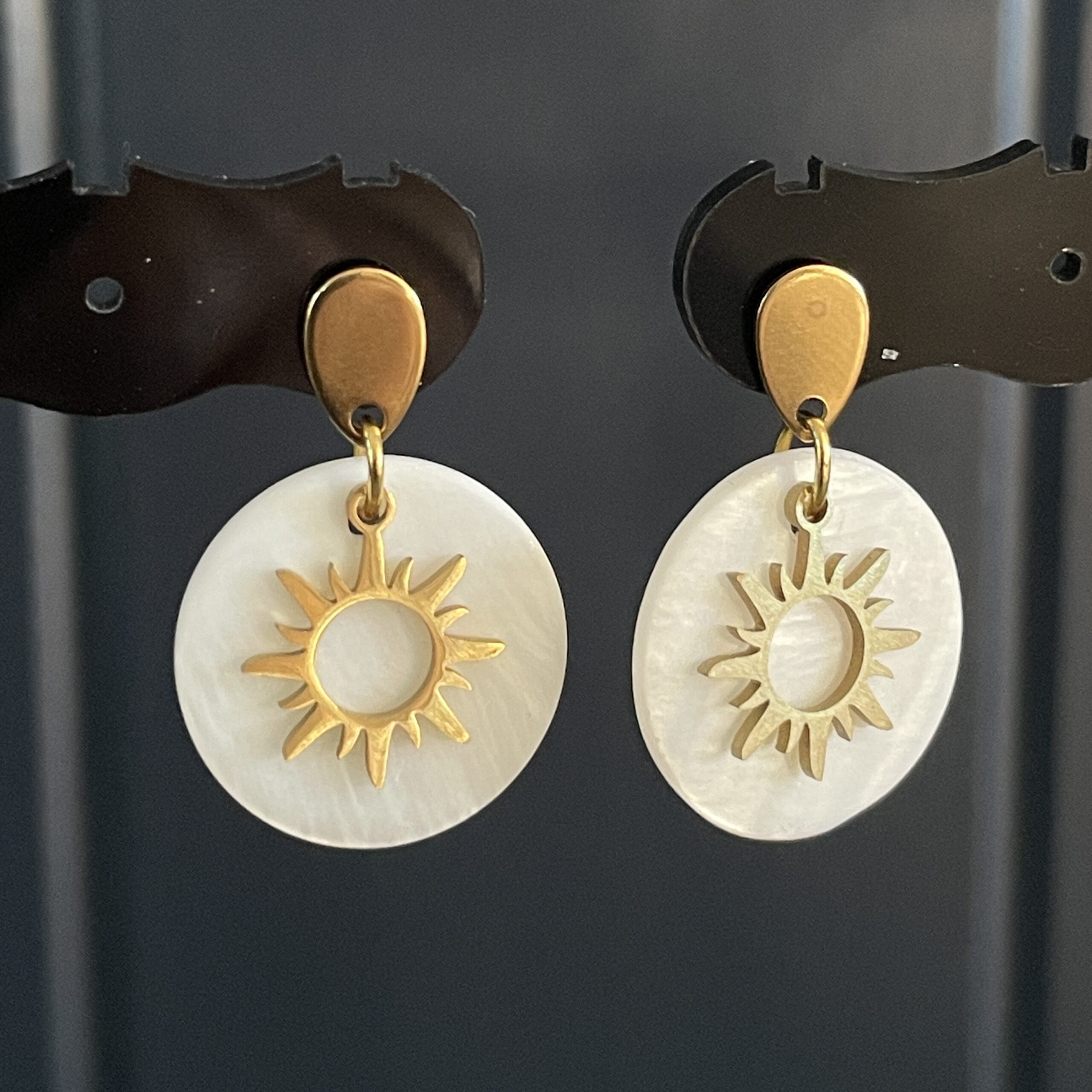 🌼Les boucles d’oreilles Saudade évoquent une douceur lumineuse empreinte de poésie. Leur disque nacré, aux reflets doux et laiteux, sert d’écrin à un motif solaire doré finement ajouré, symbole de chaleur, de souvenir et d’émotion.