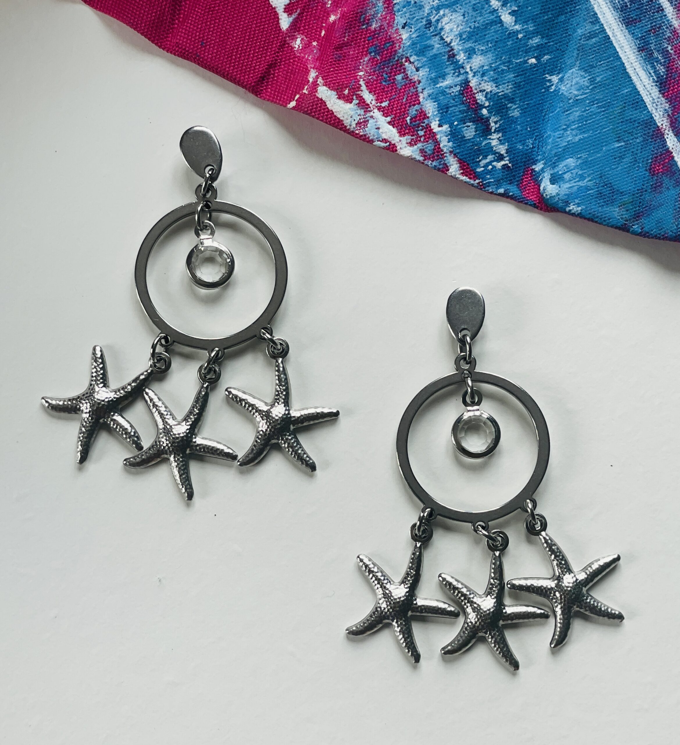 Ces boucles d’oreilles aux petites étoiles de mer et au cercle lumineux évoquent l’esprit marin et bohème de Sauzon, charmant port de pêche situé au nord de Belle-Île-en-Mer, en Bretagne.