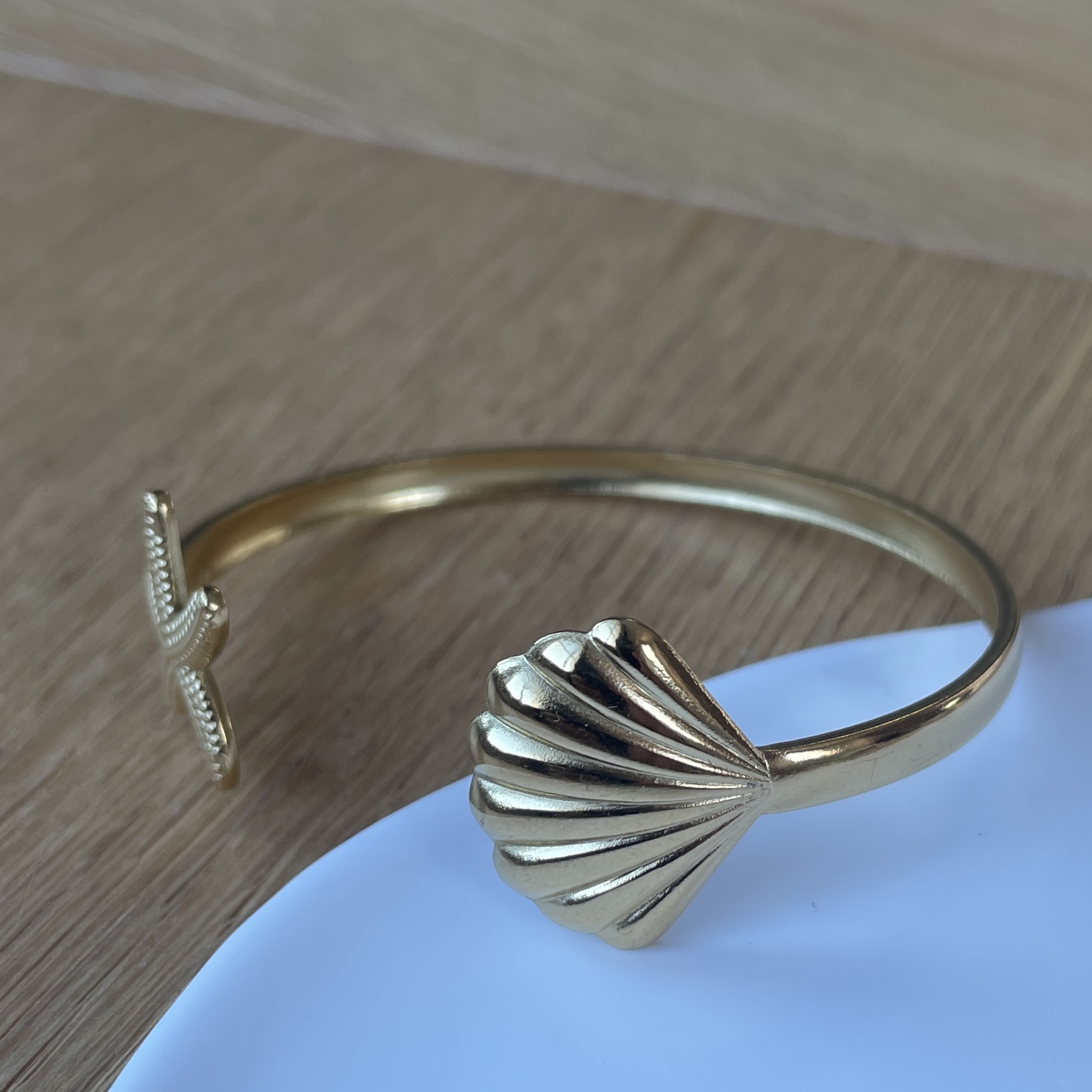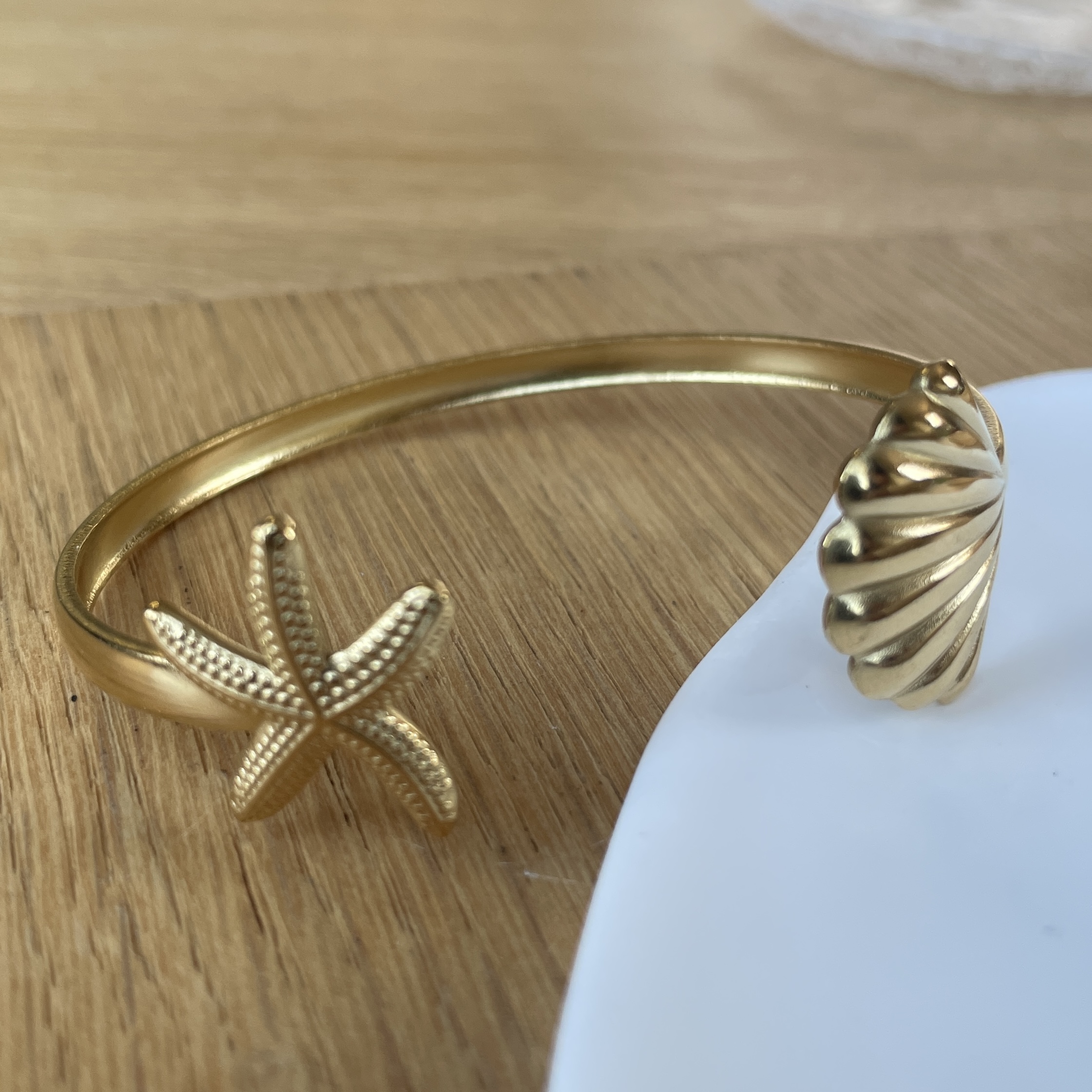 Son jonc doré ouvert est sublimé par deux symboles emblématiques : une étoile de mer finement texturée et un coquillage aux courbes délicates.