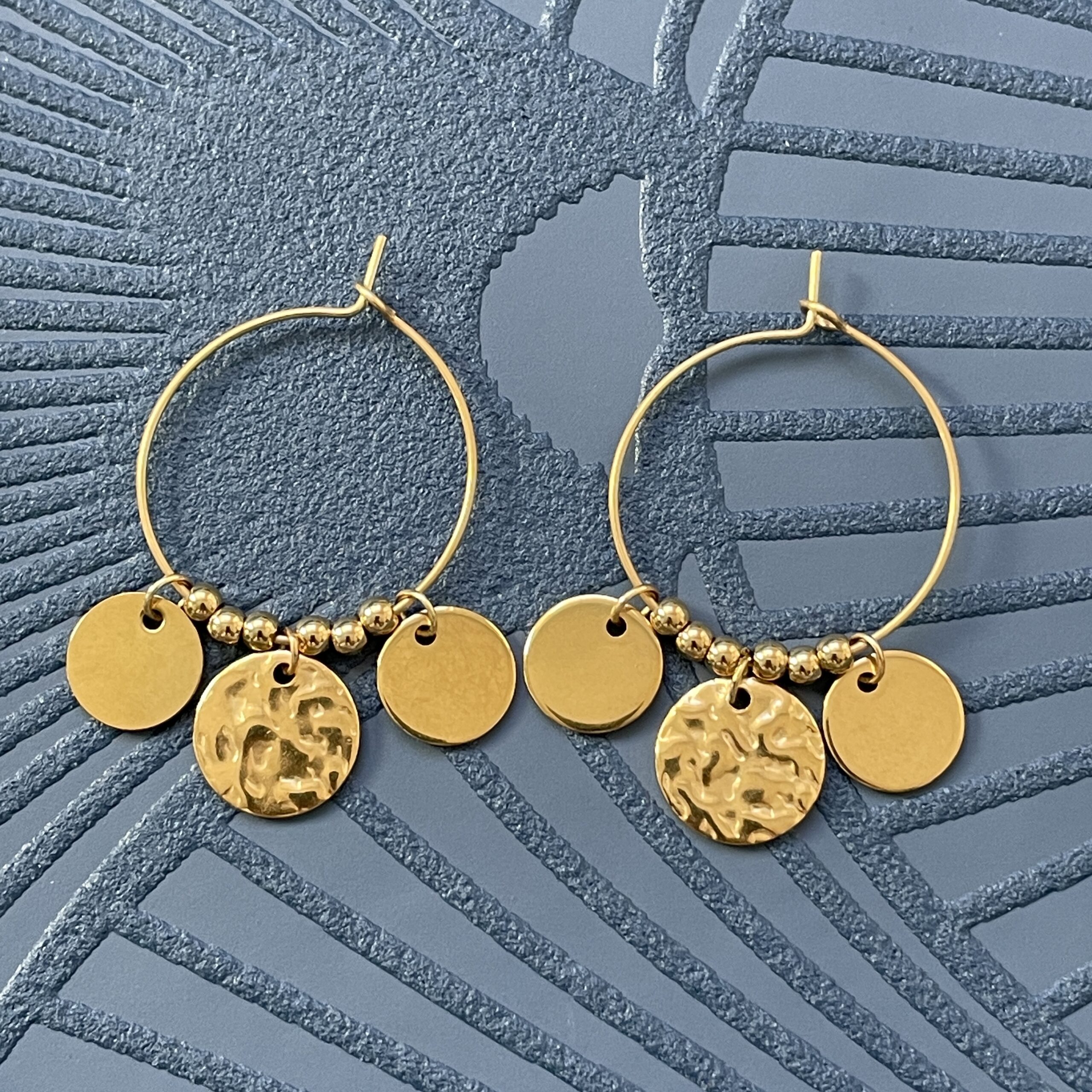 Solaires et pleines de caractère, les boucles d’oreilles Solena associent la finesse d’une créole dorée à un jeu de pampilles circulaires. De délicates perles dorées rythment l’anneau, tandis que des médaillons lisses et martelés captent la lumière et créent de subtils reflets à chaque mouvement.
